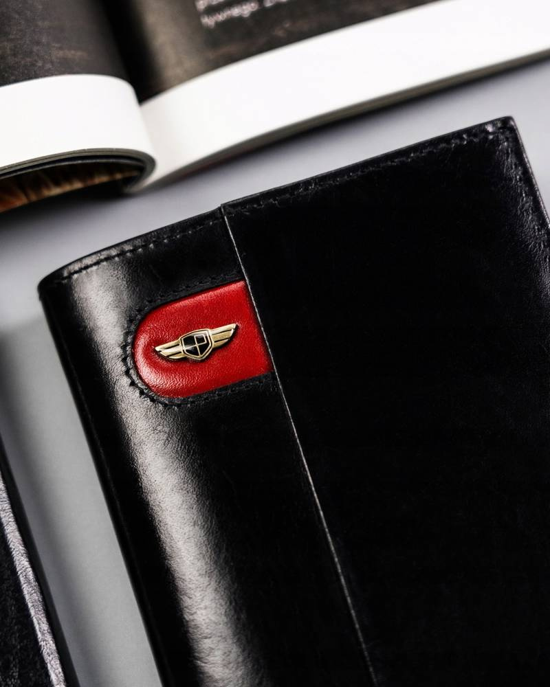 - Ergonomiczny design | Odszyty bardzo trwale z doskonałej jakości gładkiej skóry naturalnej w czarnym kolorze, dodatkowo na froncie portfela wyszyto trójkolorowy paseczek;