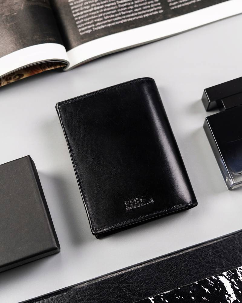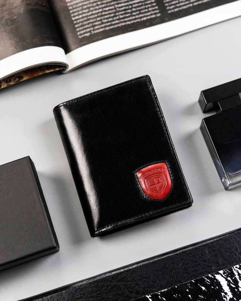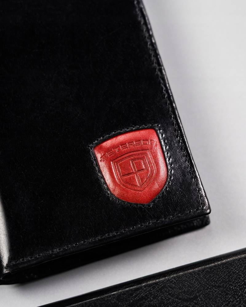 - Focus na detale | Odszyty bardzo trwale z doskonałej jakości gładkiej skóry naturalnej w czarnym kolorze, dodatkowo na froncie portfela wyszyto logo na czerwonej tarczy;