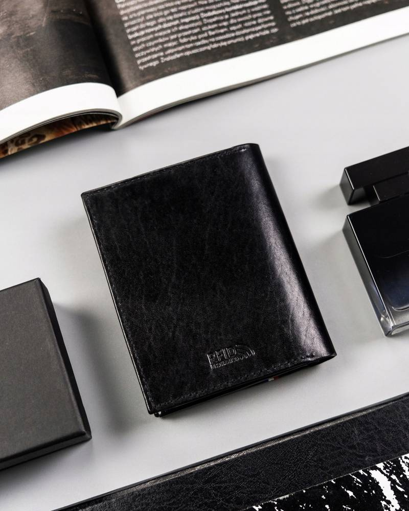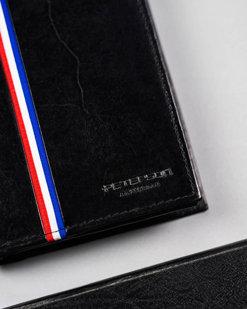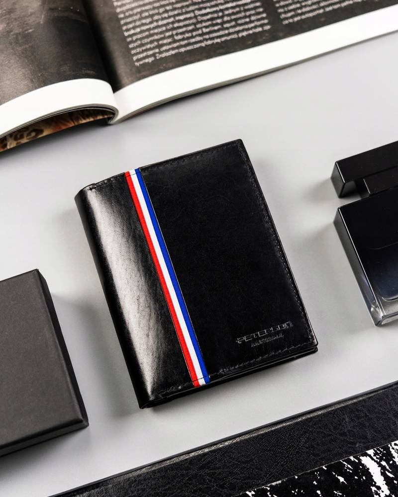 - Ergonomiczny design | Odszyty bardzo trwale z doskonałej jakości gładkiej skóry naturalnej w czarnym kolorze, dodatkowo na froncie portfela wyszyto trójkolorowy paseczek;