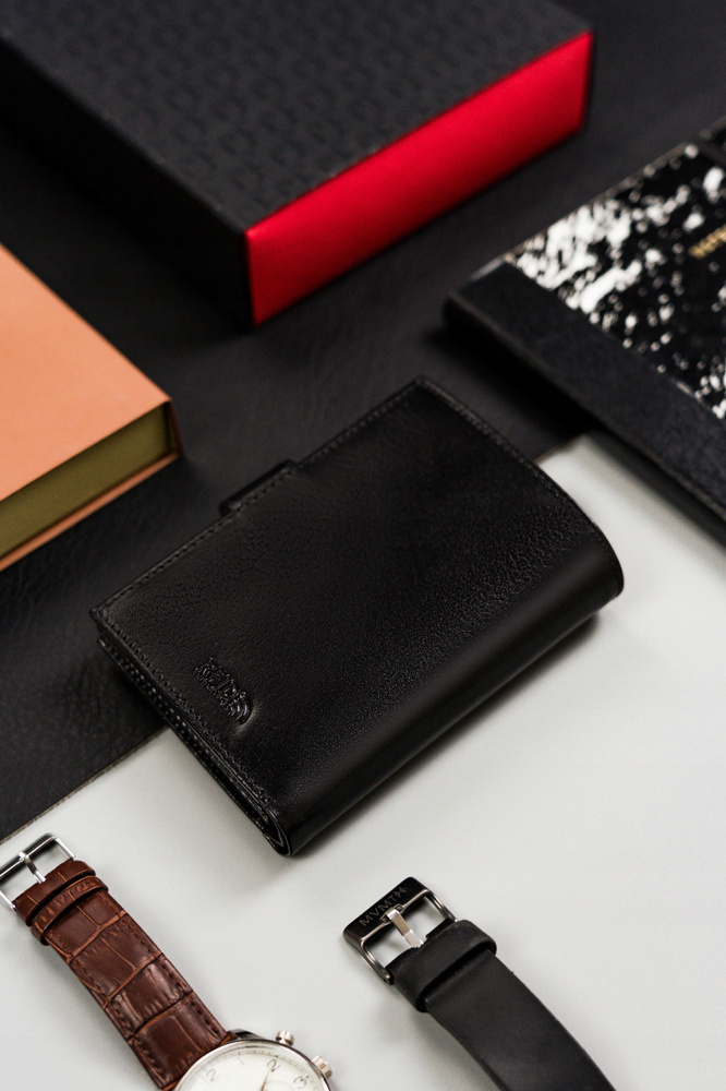 - Klasyczny styl | Męski design w czarnej kolorystyce. Elegancki portfel, który będzie świetnym dodatkiem zarówno na co dzień jak i na formalne okazje. Odpowiednio zaprojektowany rozmiar, dzięki któremu pomieści on nawet dowód osobisty, jednak bez problemu można go nosić w kieszeni spodni. Portfel o orientacji pionowej;