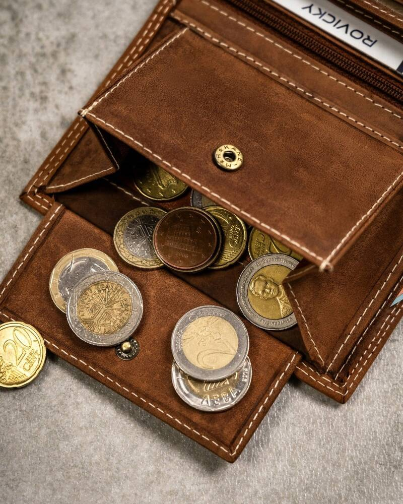 W kieszeniach na banknoty i monety zmieścisz satysfakcjonującą ilość gotówki.