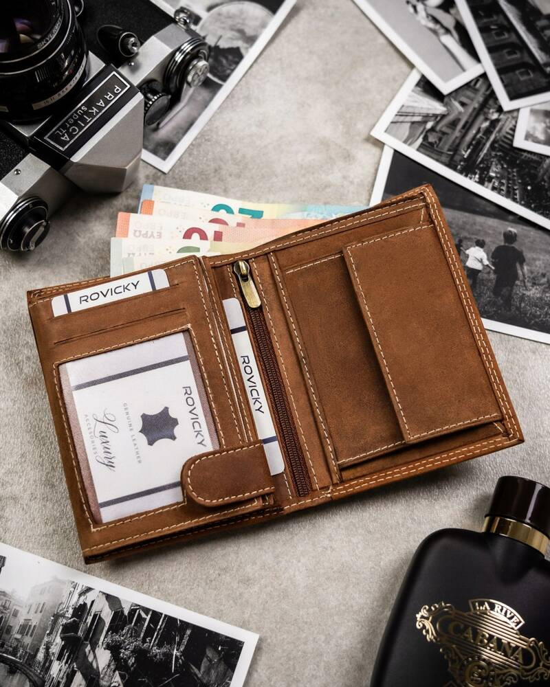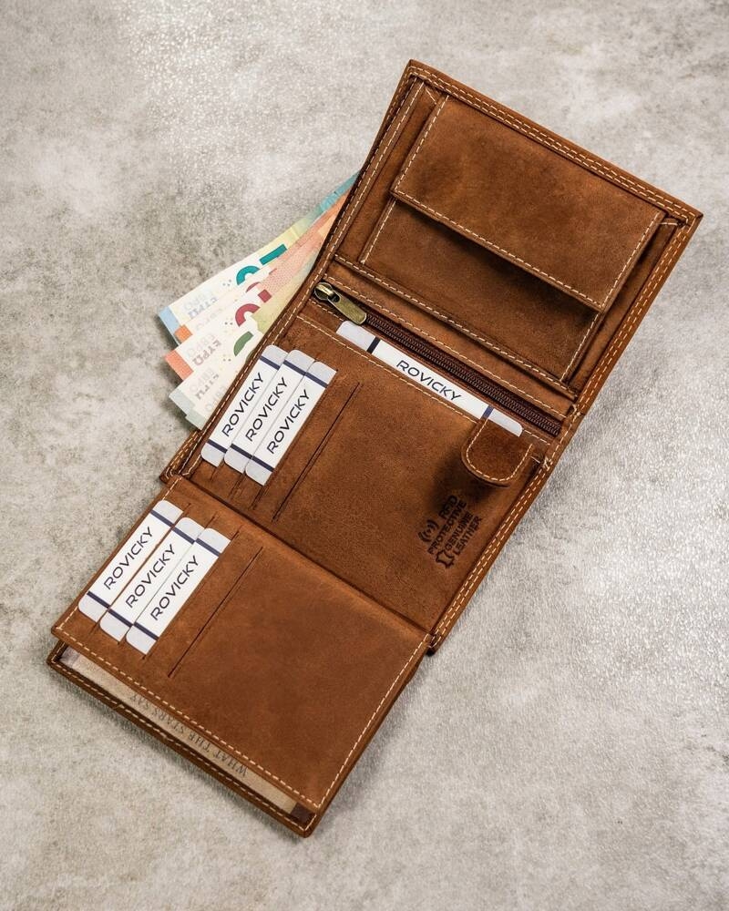 Posiada rozbudowane wnętrze – będzie idealnym wyborem właśnie dla Ciebie, jeżeli na co dzień nosisz dokumenty w dużym formacie jak np. dowód rejestracyjny. Ponadto zmieścisz w nim pokaźne ilości kart oraz gotówki.
