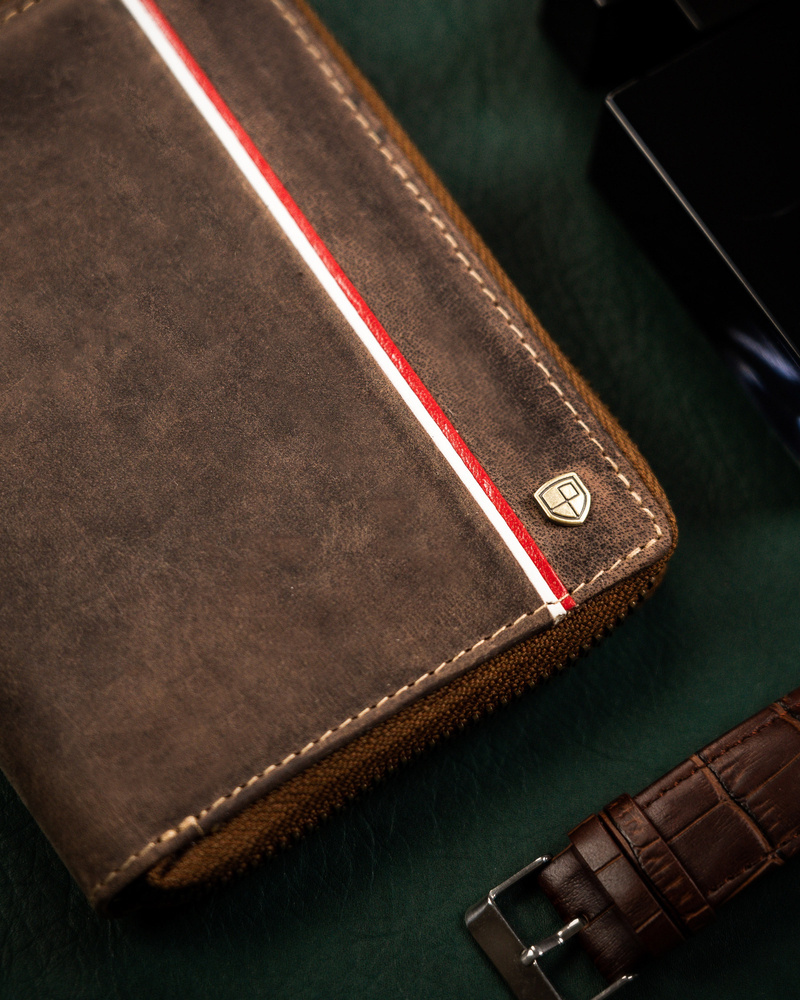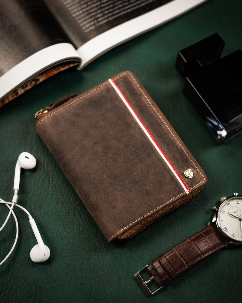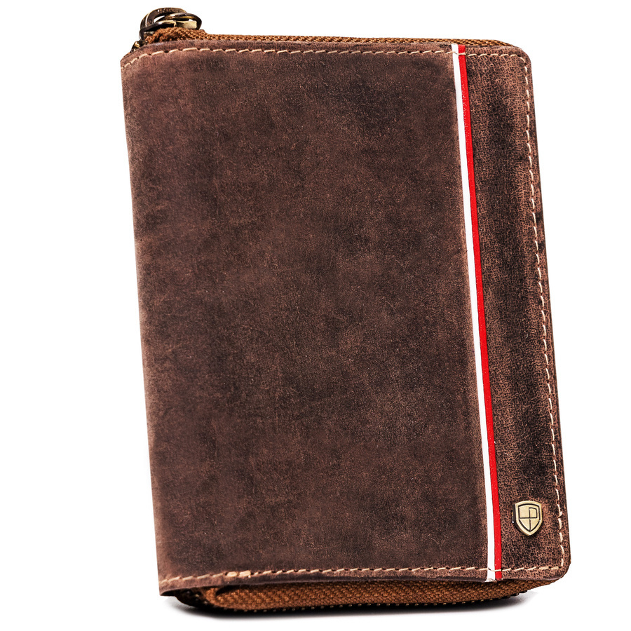 - Patriotyczny design | Portfel o klasycznej stylistyce. Model w orientacji pionowej zapinany w całości na zamek. Na froncie mieści się pionowe przeszycie w barwach polskiej flagi;