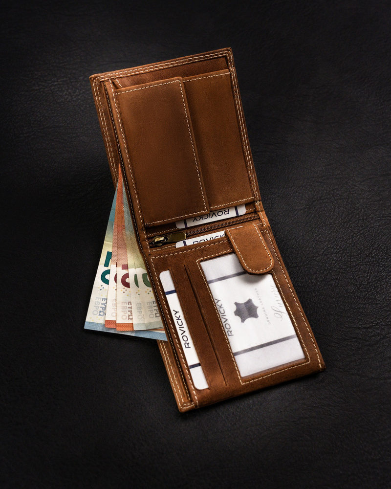 Posiada rozbudowane wnętrze – będzie idealnym wyborem właśnie dla Ciebie, jeżeli na co dzień nosisz dokumenty w dużym formacie jak np. dowód rejestracyjny. Ponadto zmieścisz w nim pokaźne ilości kart oraz gotówki.