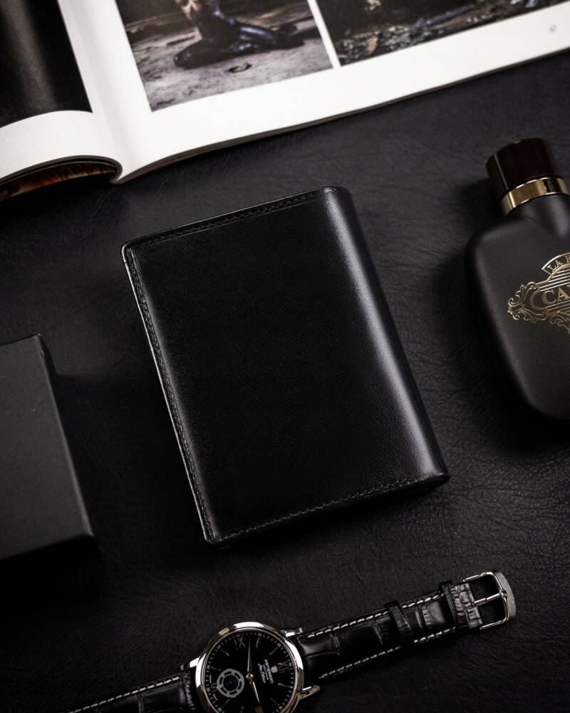 • Klasyczny, ponadczasowy design | Portfel w orientacji pionowej bez zapięcia zewnętrznego. Czarny kolor oraz prosty fason bez przesadnych zdobień;