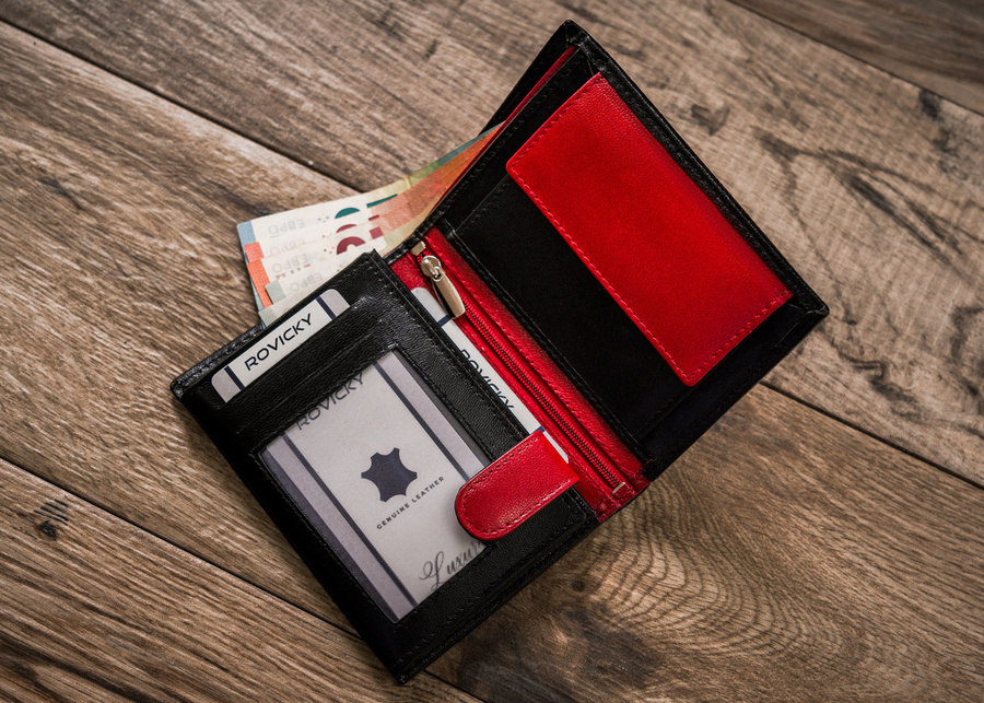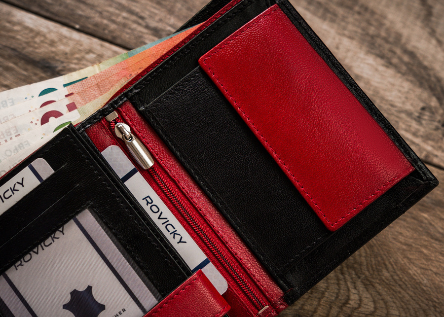 - banknoty schowasz do 2 otwartych kieszonek umiejscowionych po całej długości portfela.