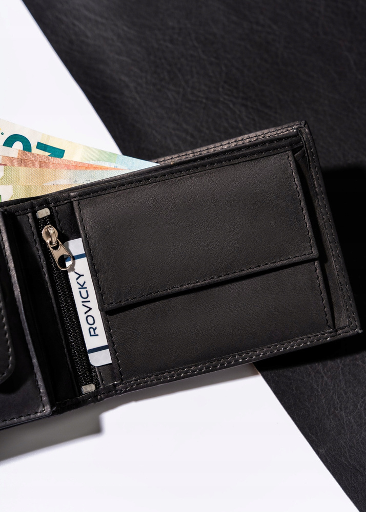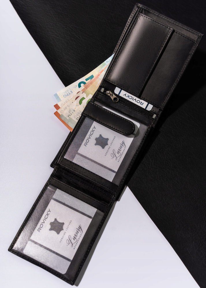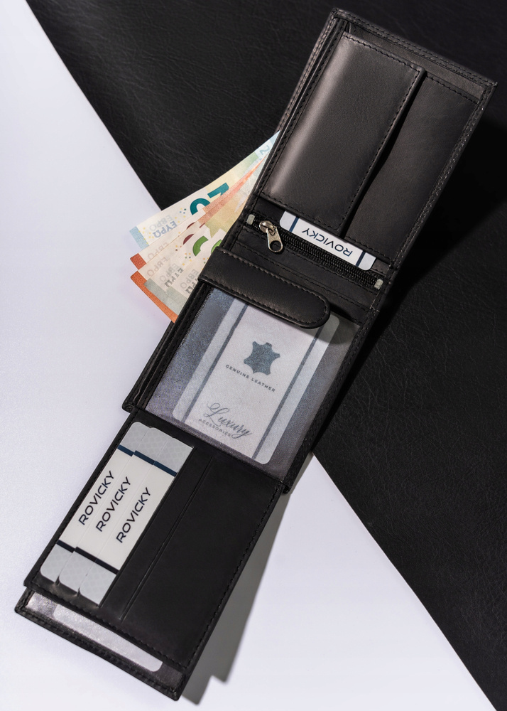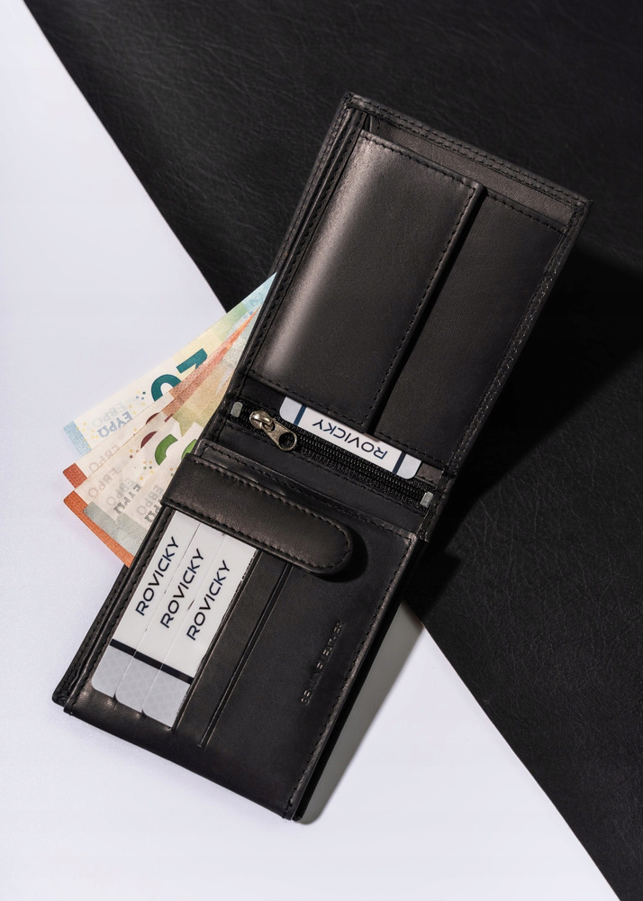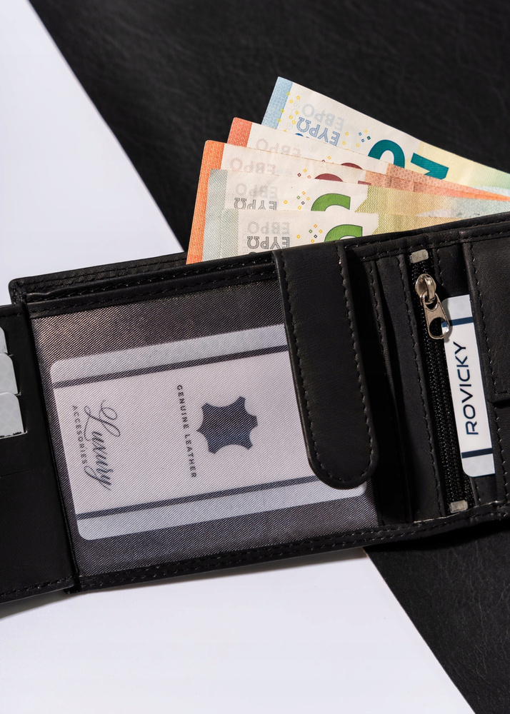 - 2 przegródki na banknoty, które ułatwią sortowanie pieniędzy. Kieszenie są wystarczająco pojemne, że bez problemu zmieszczą większe ilości banknotów.