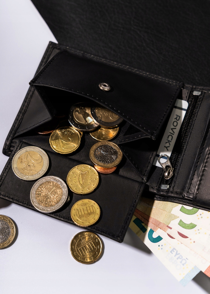 - 1 kieszeń na bilon zamykaną na zatrzask, która pozwala bezpiecznie przechowywać monety. Dzięki przemyślanej konstrukcji, wyjmowanie z niej drobnych jest bardzo wygodne.