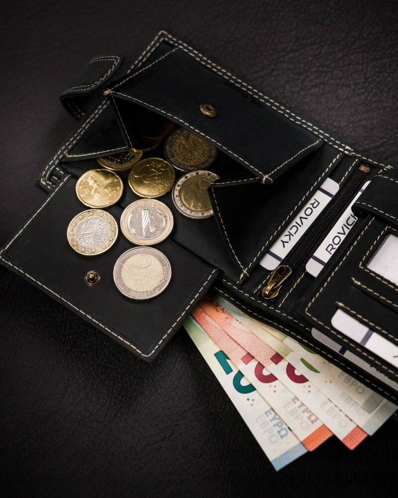 W kieszeniach na banknoty i monety zmieścisz satysfakcjonującą ilość gotówki.