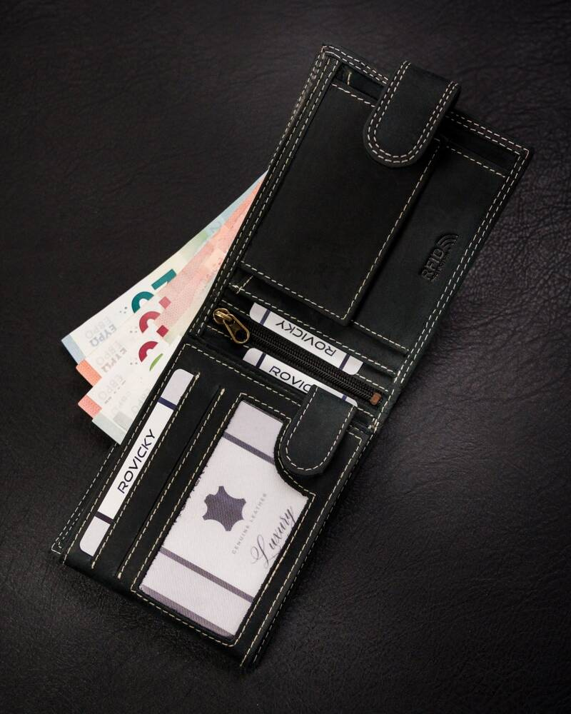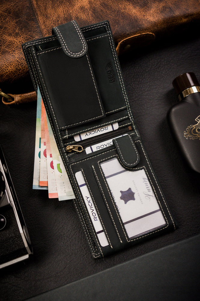 - banknoty schowasz do 2 otwartych, szerokich przegródek, wykończonych materiałową podszewką.