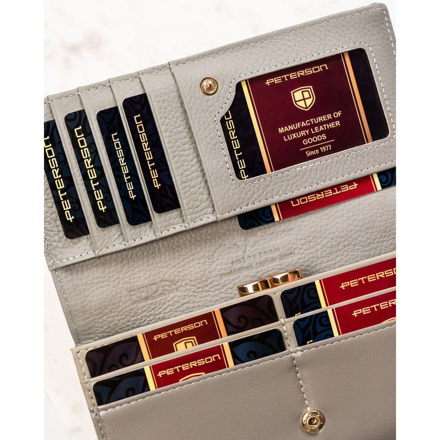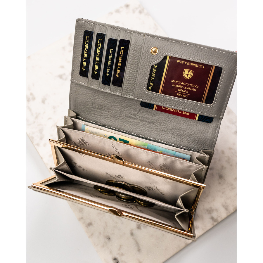 - Tył portfela oraz wnętrze wykonane są z gładkiej, szarej skóry naturalnej, która doskonale dopełnia całą kompozycję.