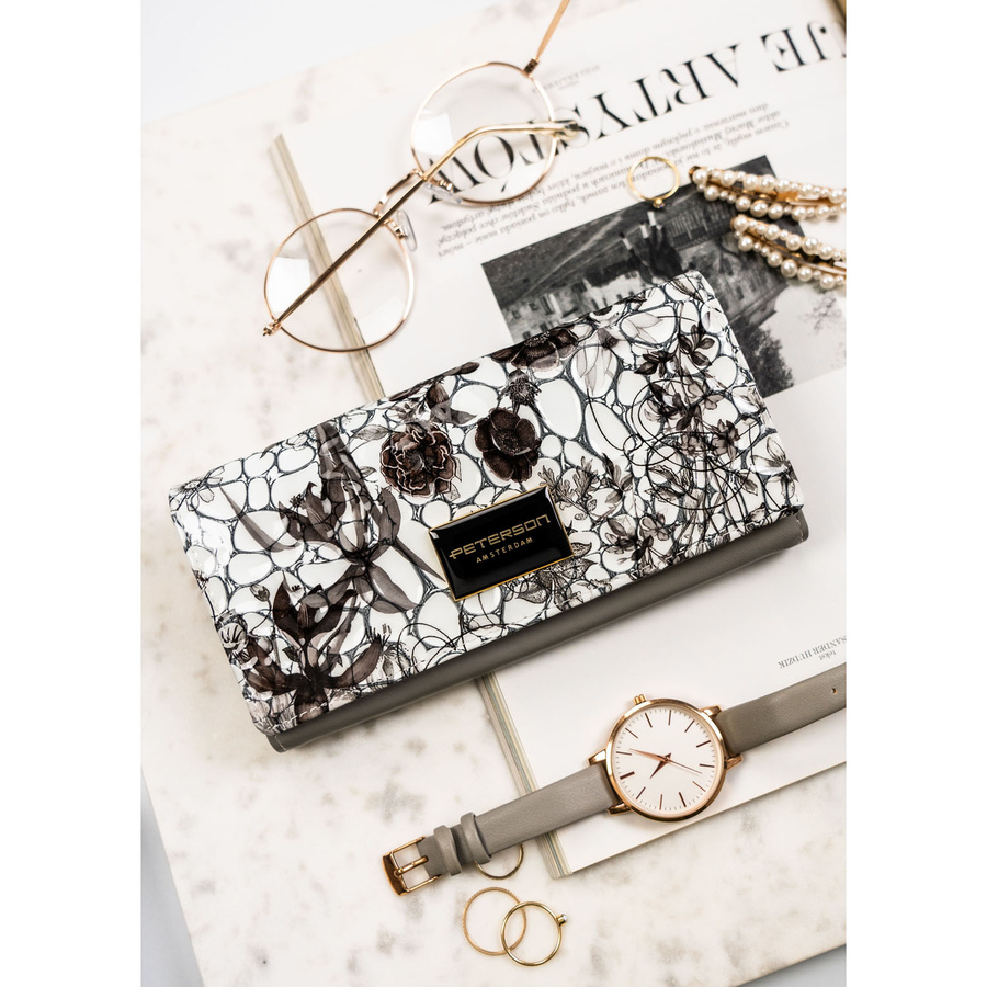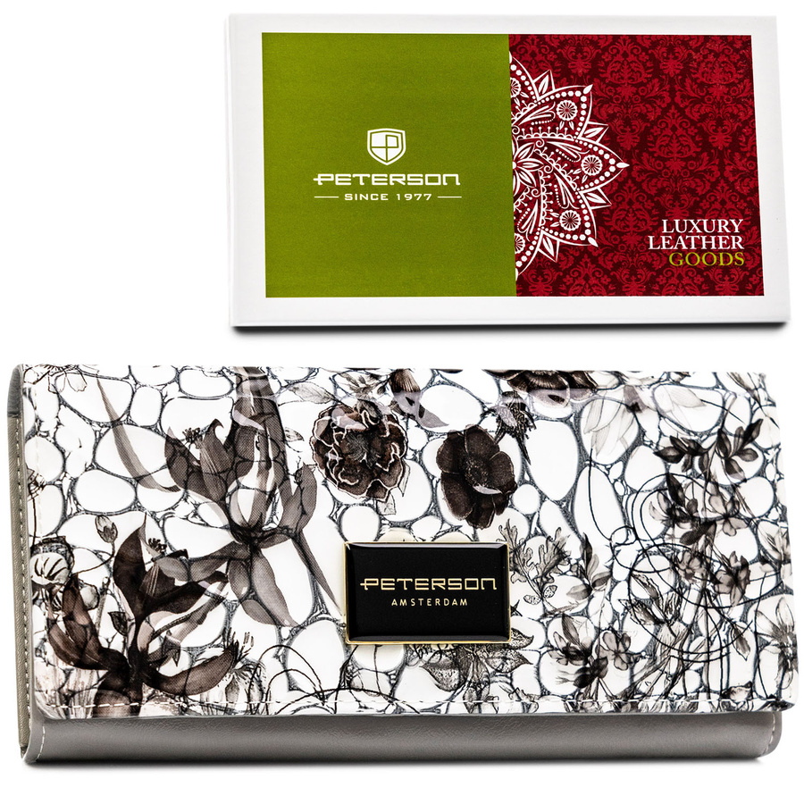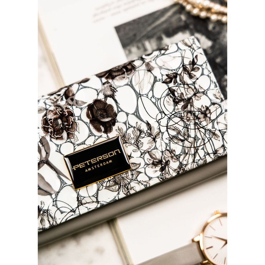 Duży, poziomy portfel damski na zatrzask, wykonany z lakierowanej skóry naturalnej w kwiatowy wzór – Peterson