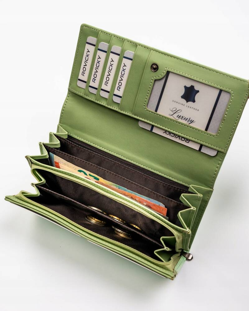 - 2 kieszonki na większe dokumenty; Jedna schowana jest za sekcją na karty, druga natomiast umiejscowiono w centralnej części portfela, zamykana suwaczkiem.