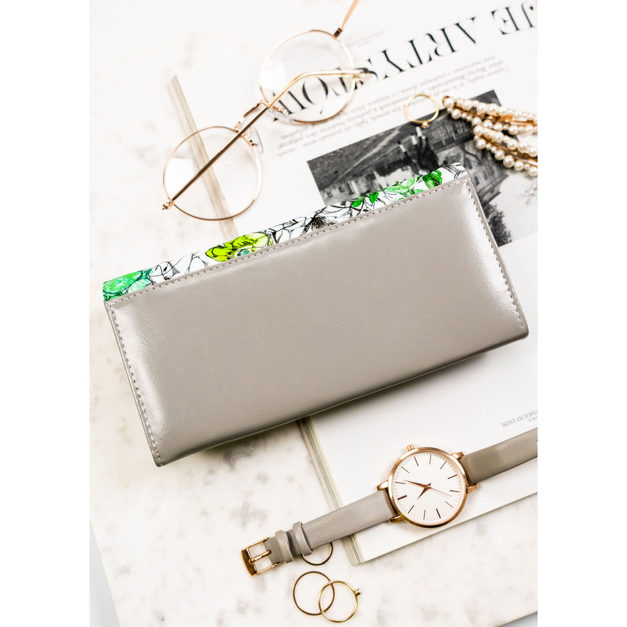- Bogaty, kwiatowy motyw na froncie portfela przyciąga wzrok już od pierwszego spojrzenia. Zielone kwiaty na białym tle tworzą artystyczny design, który podkreśla szykowny charakter tego dodatku.