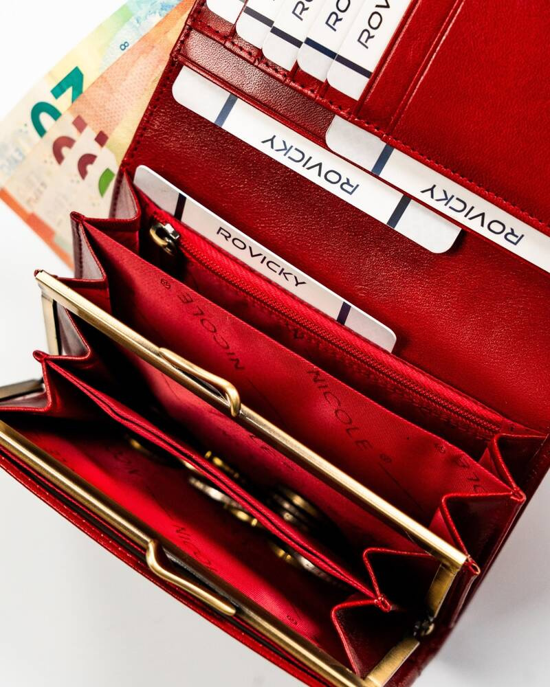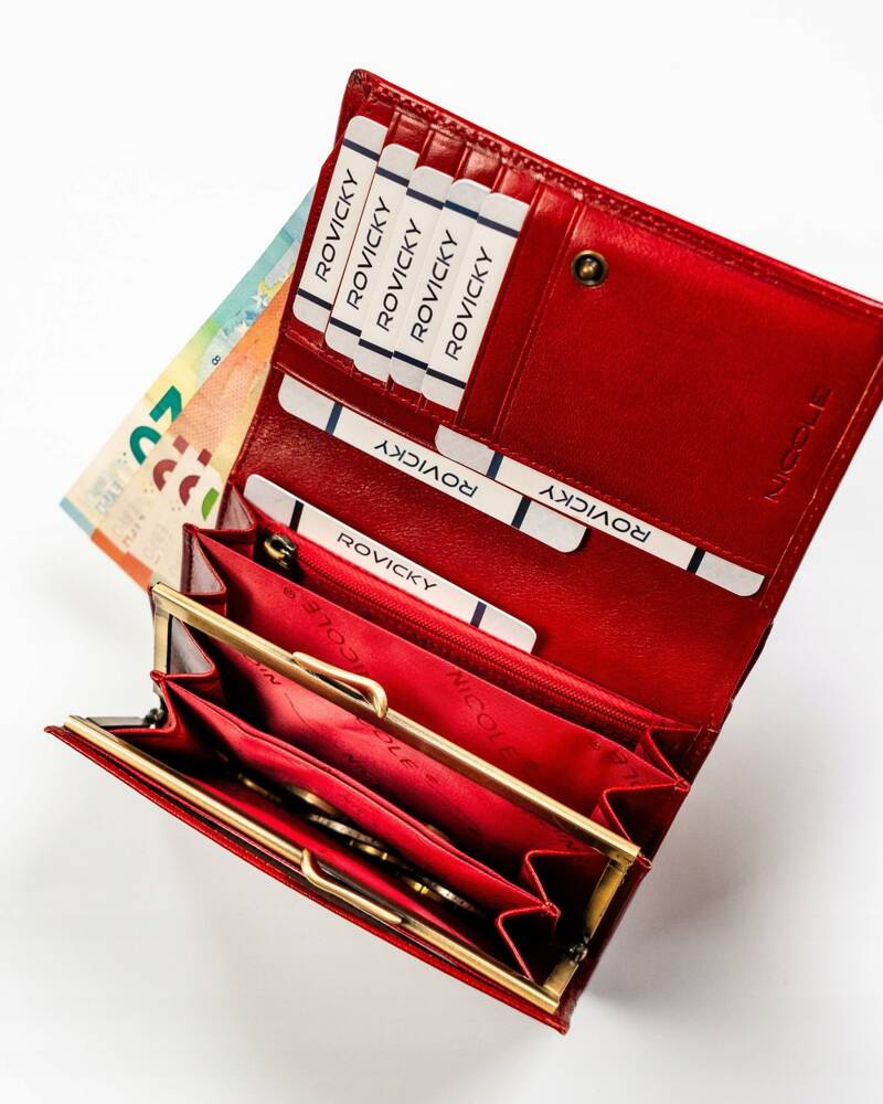 - Na banknoty jest wydzielonych 5 pojemnych przegródek w tym 4 otwarte przegródki i 1 zamykana na suwak. Duża ilość przegródek na pieniądze pozwoli na uporządkowanie gotówki ze względu na nominał lub rodzaj waluty.