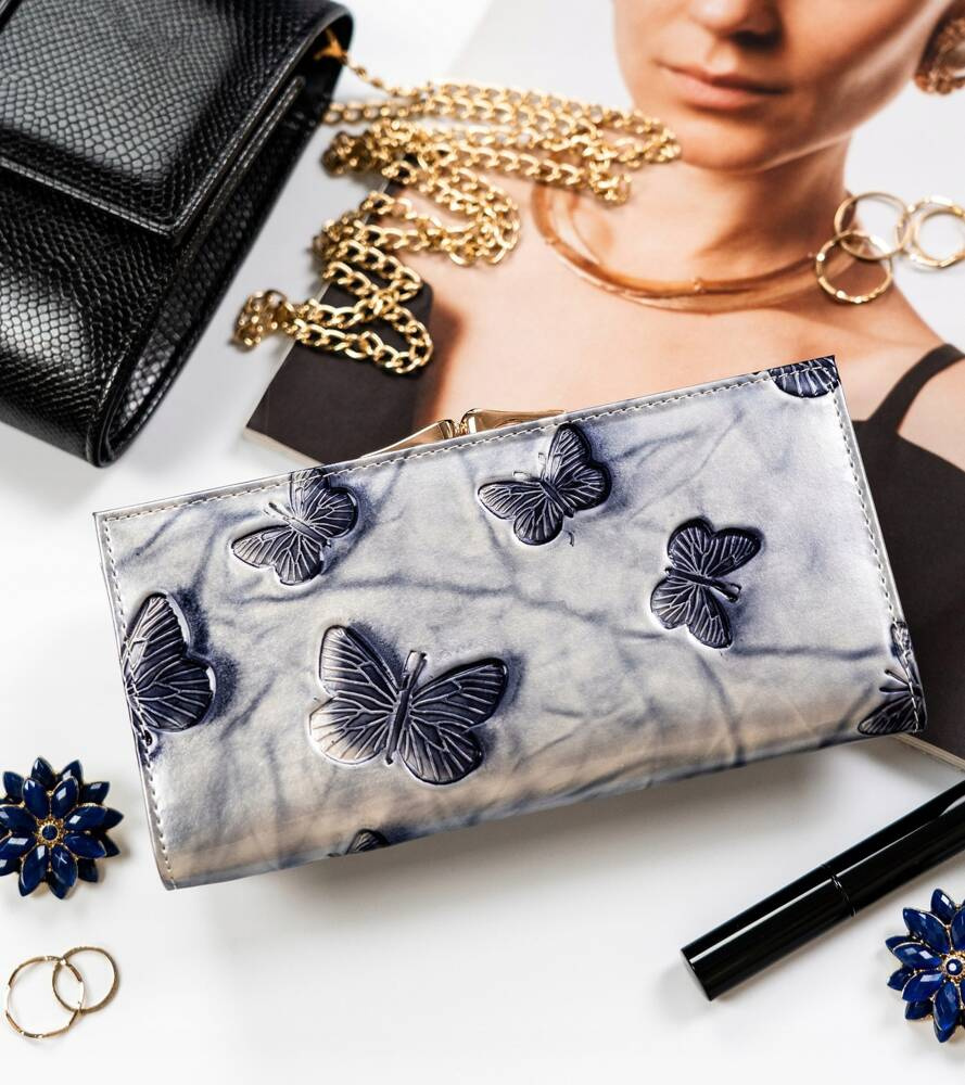 - Oryginalny design | Model w srebrnym kolorze, ze wzorem w motylki. Zamykany dwoma klapkami na zatrzask. Front ozdobiony złotym logo marki;