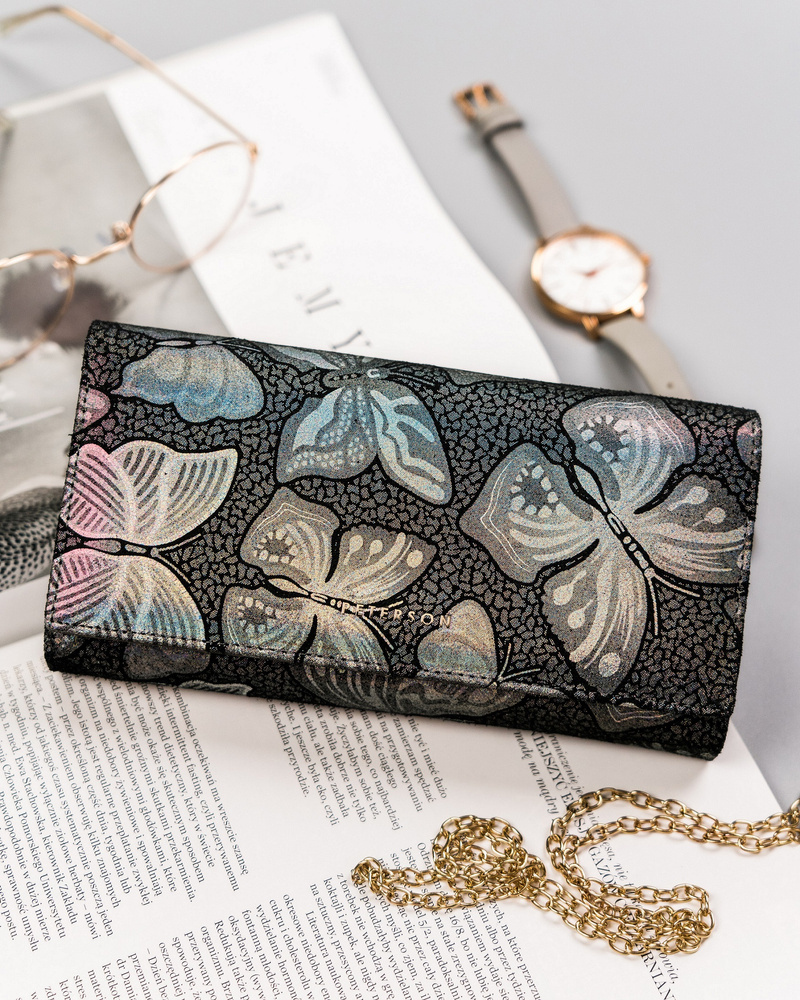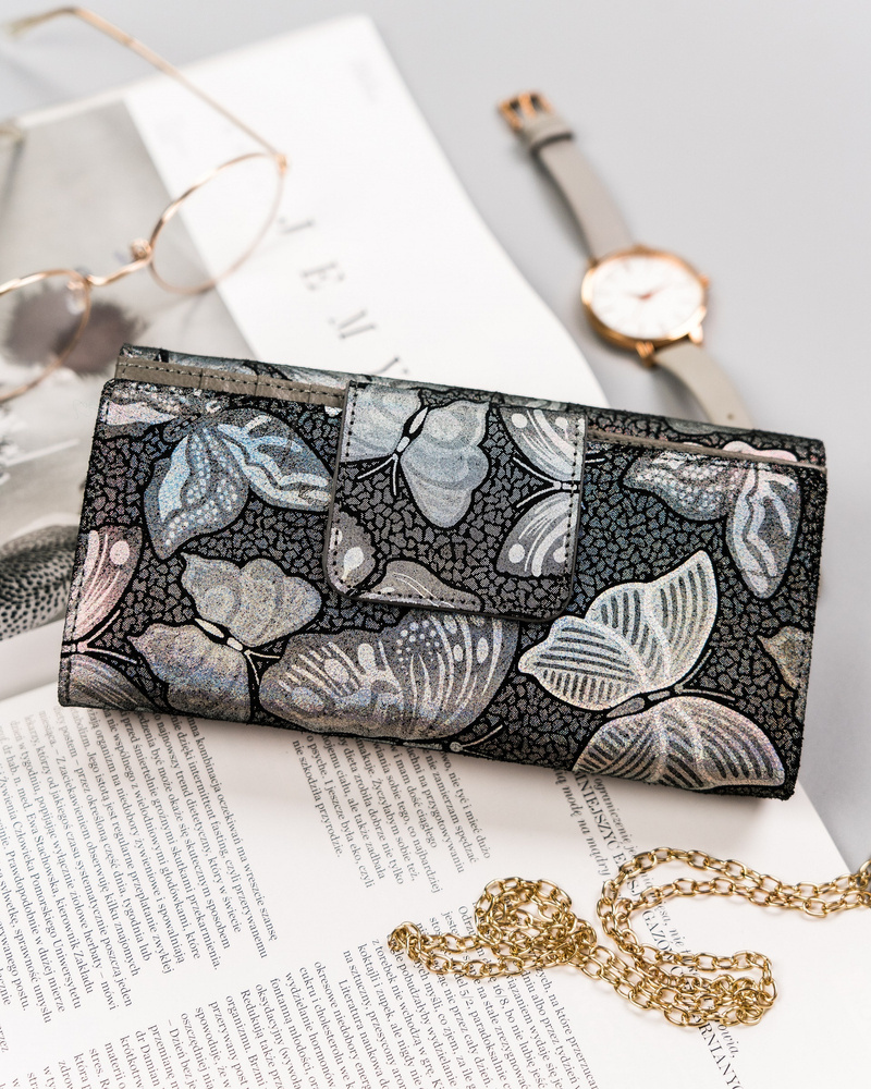 - Klasyczny fason z oryginalnymi detalami | Portfel o klasycznej stylistyce i nietypowym holograficznym wzorze w motylki. Model w orientacji poziomej, zapinany bezpiecznym i trwałym zatrzaskiem, dodatkowo na froncie portfela widnieje złote logo marki;
