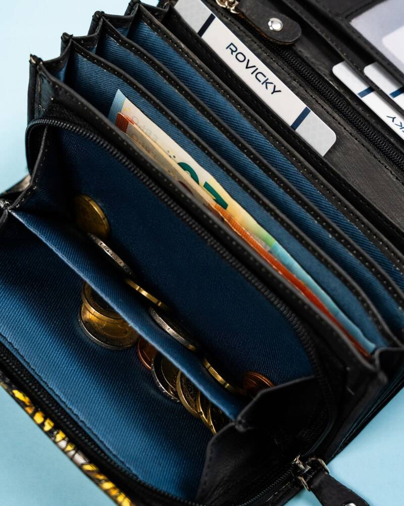 - Pojemny, podwójny schowek na bilon zamykany na suwak, w którym pomieścisz sporą ilość monet.