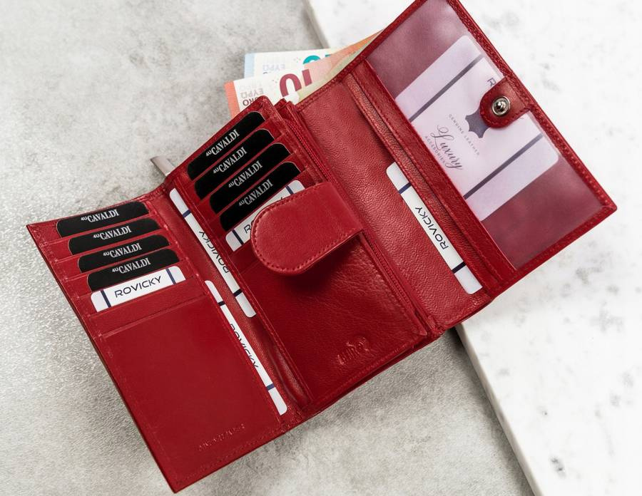 • 6 kieszonek na dokumenty w większym formacie, jak dowód rejestracyjny w okładce. Jedna z tych kieszonek mieści się po zewnętrznej części, z tyłu portfela, jest zamykana na zameczek;