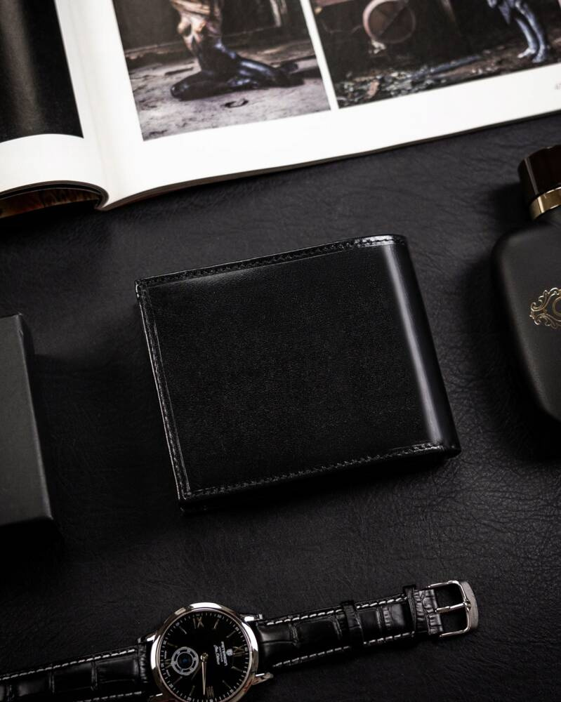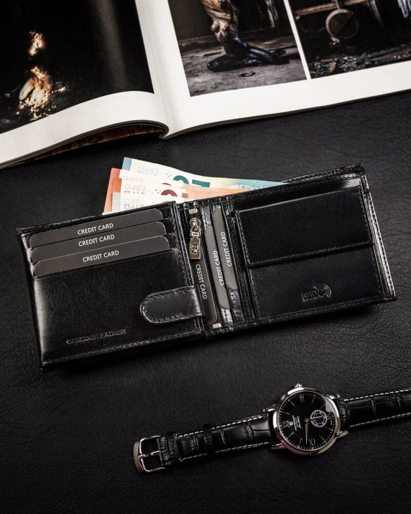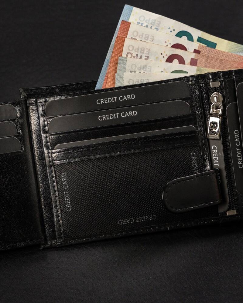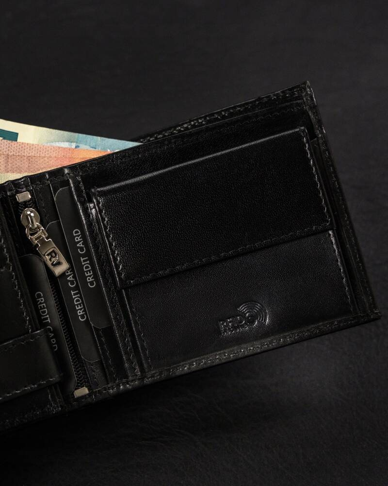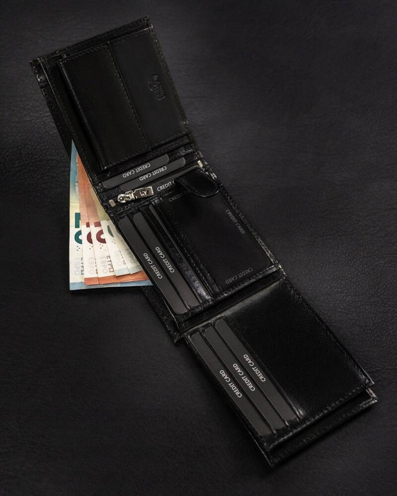 - 2 schowki na suwak, pierwszy w centralnej części portfela, drugi za sekcją na banknoty.