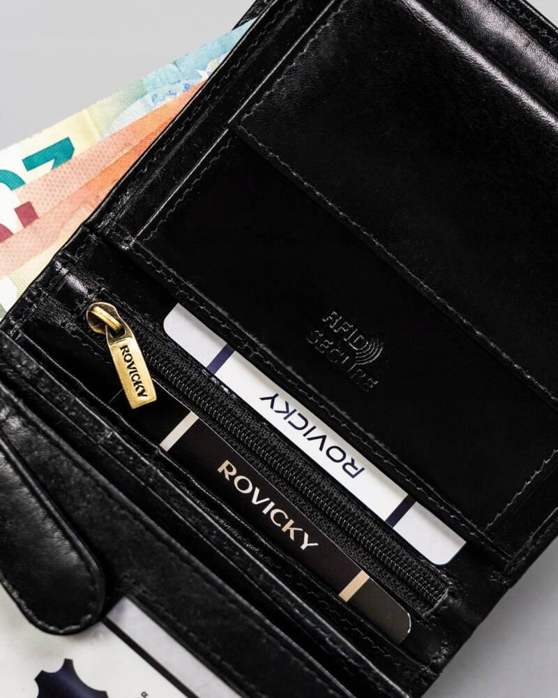- Bezpieczeństwo na wysokim poziomie | Wyposażony w technologie RFID, która chroni portfel przed złodziejami używającymi czytniku do kart;