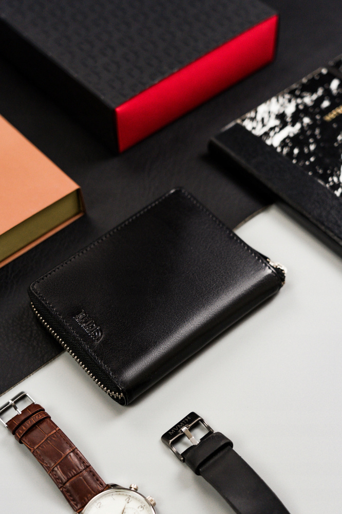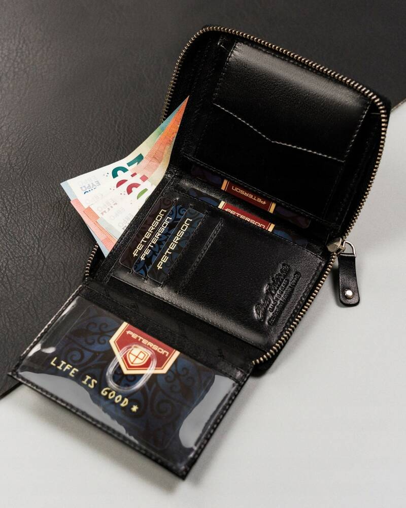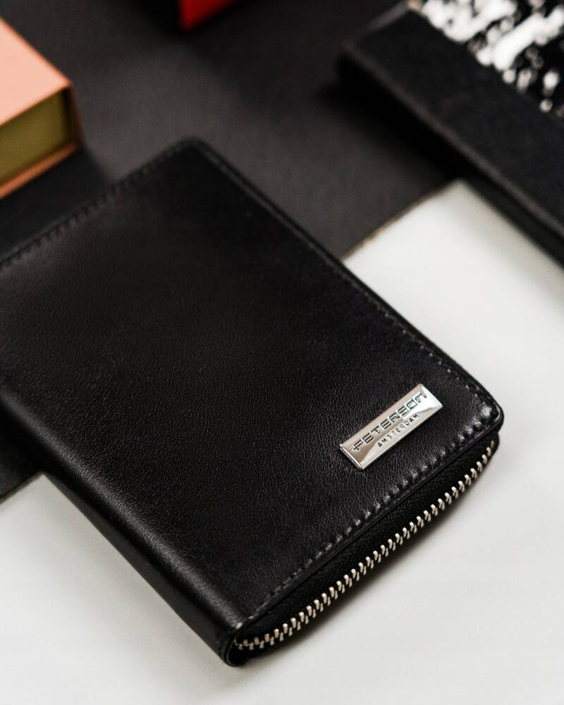 - Nowoczesny design | Elegancki portfel o czarnej kolorystyce ze srebrnymi dodatkami. Jest w orientacji pionowej i zamykany na suwak;