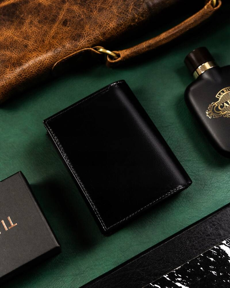- Elegancki portfel dla Panów w każdym wieku | Portfel o klasycznym designie, w czarnym kolorze. Model w orientacji pionowej bez zapięcia;