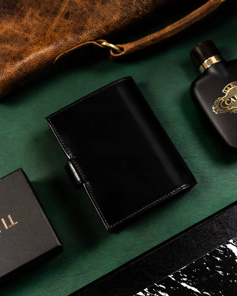 - Elegancki portfel dla Panów w każdym wieku | Portfel o klasycznym designie, w czarnym kolorze. Model w orientacji pionowej z zapięciem;