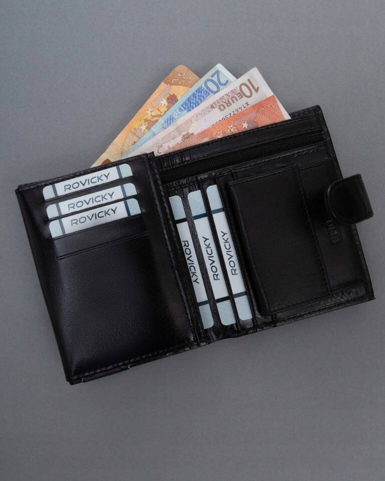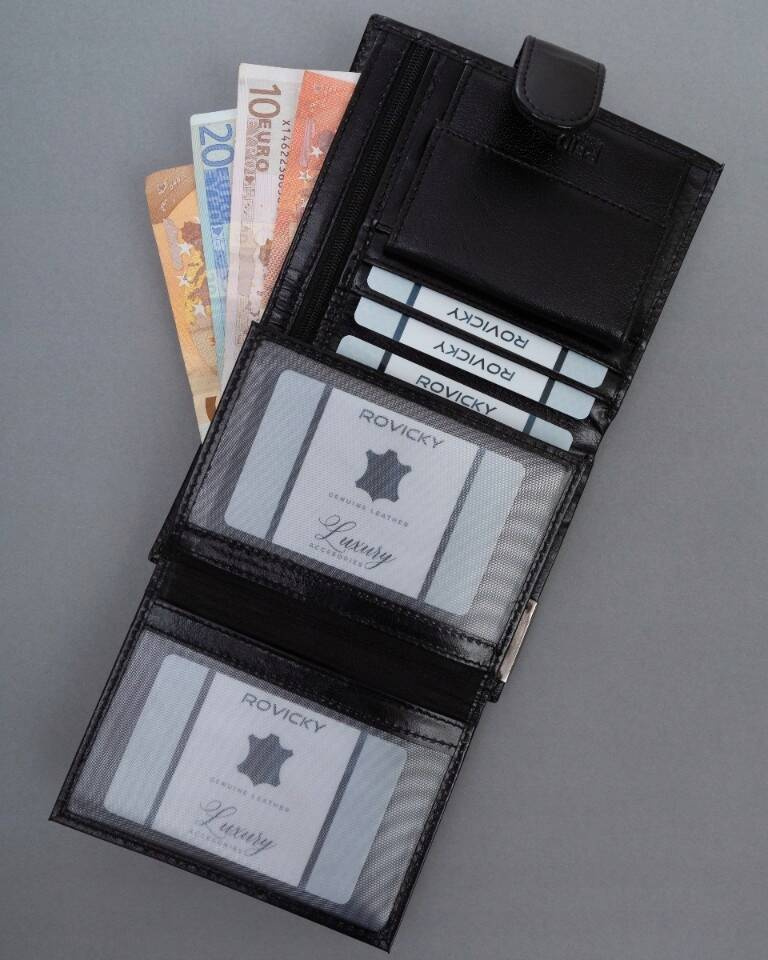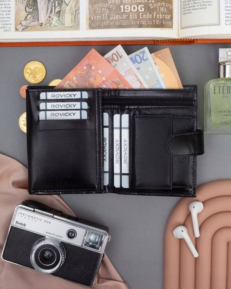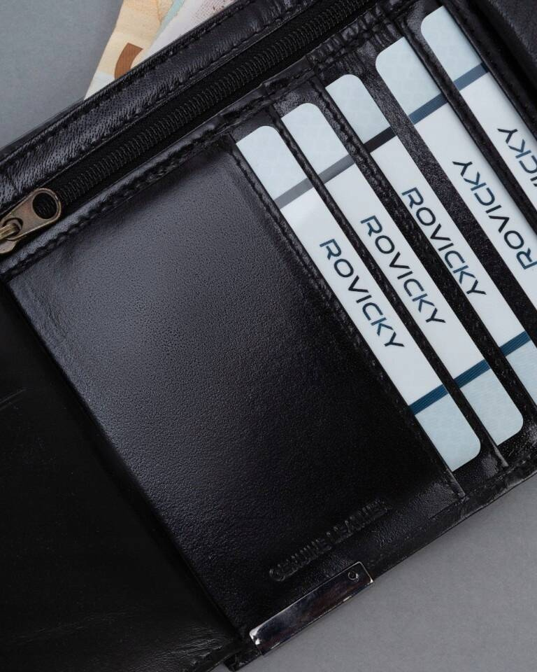 - 2 obszerne przegródki na banknoty umożliwiają przechowywanie gotówki w uporządkowany sposób. Jedna z przegródek, zamykana jest na zamek błyskawiczny.