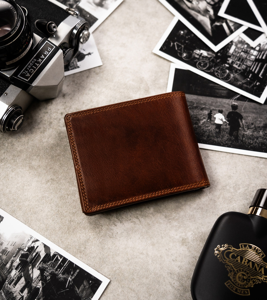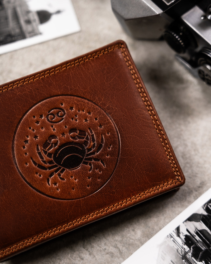 Portfel odszyty z trwałej skóry naturalnej o klasycznej stylistyce. Model w orientacji poziomej bez zapięcia zewnętrznego. Jako symbol Twojej osobowości na froncie portfela został wytłoczony Twój znak zodiaku, co sprawia, że nabiera on uroku i oryginalności.