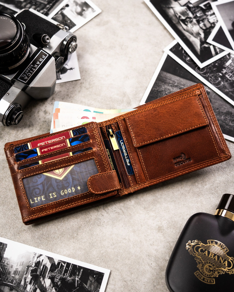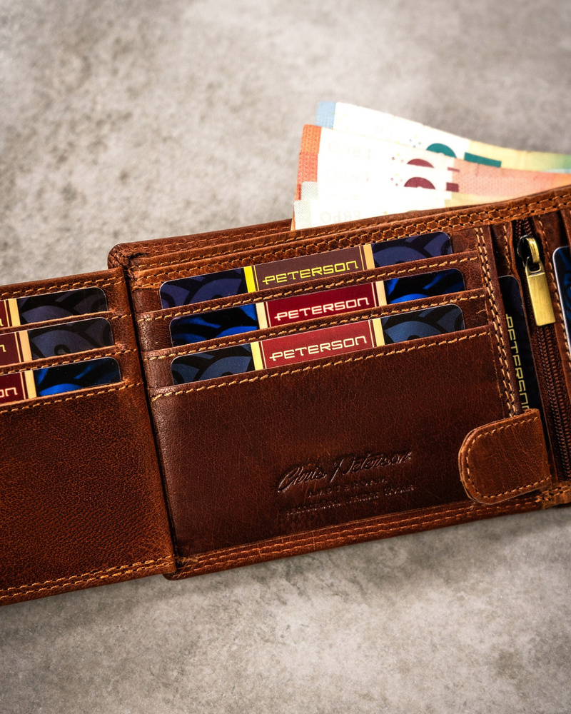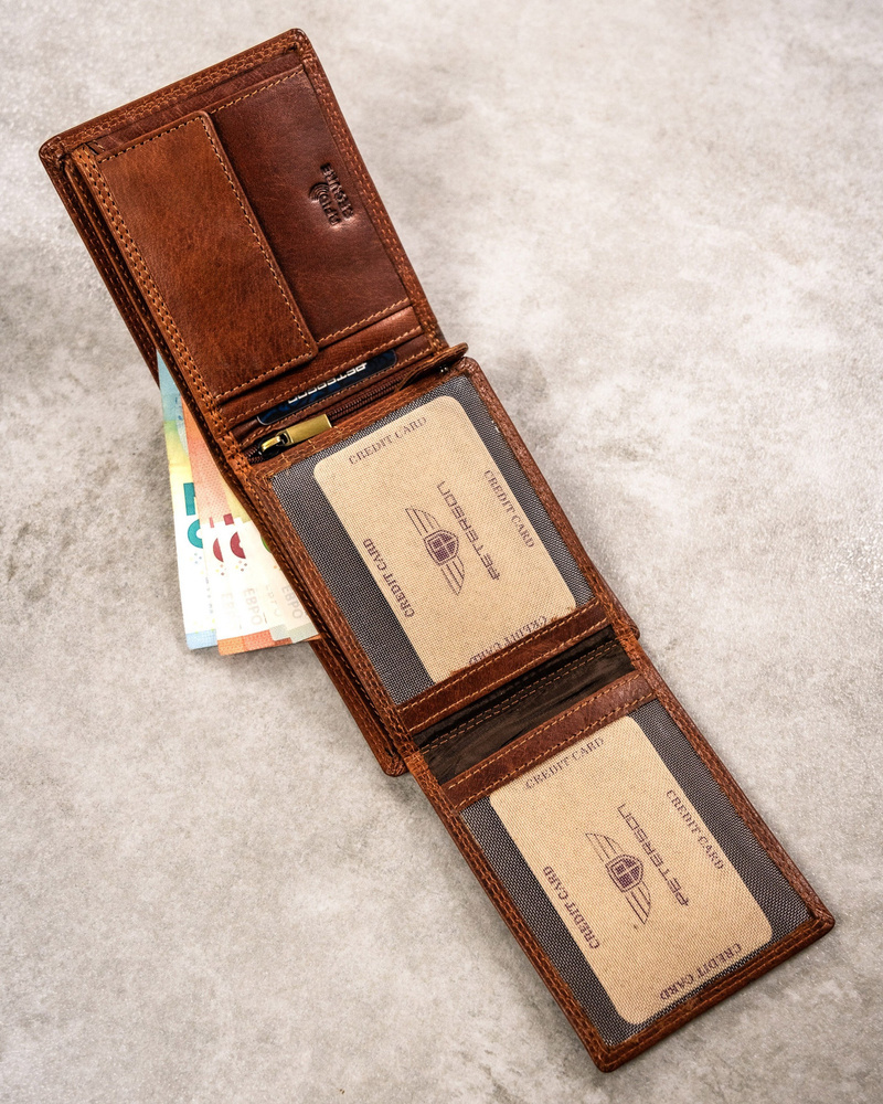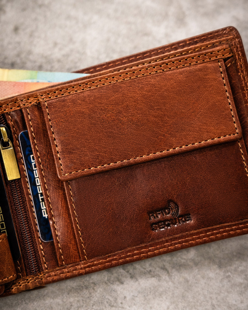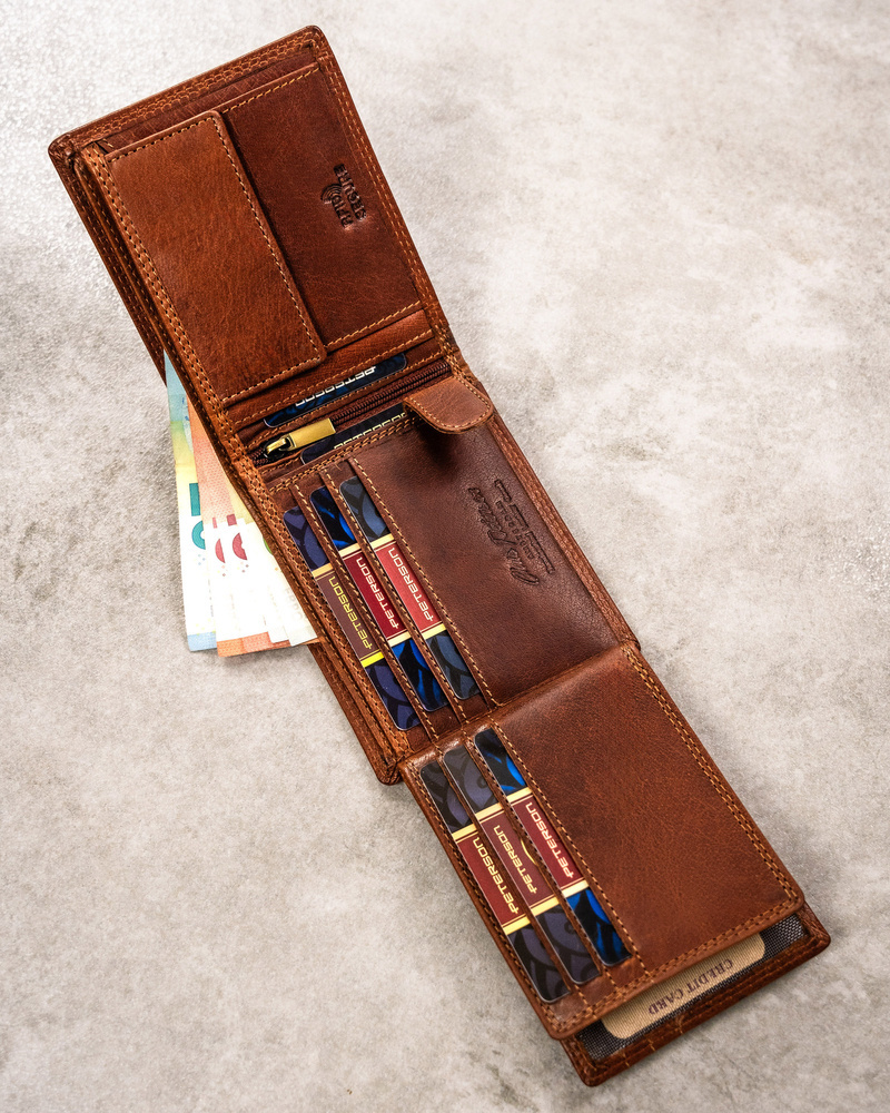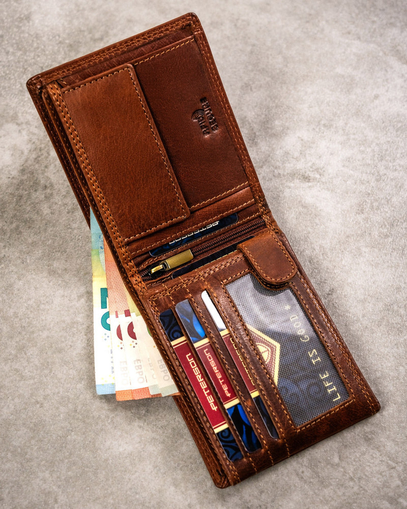 Posiada rozbudowane wnętrze – będzie idealnym wyborem, jeżeli na co dzień nosisz dokumenty w dużym formacie jak np. dowód rejestracyjny. Ponadto zmieścisz w nim pokaźne ilości kart oraz gotówki.