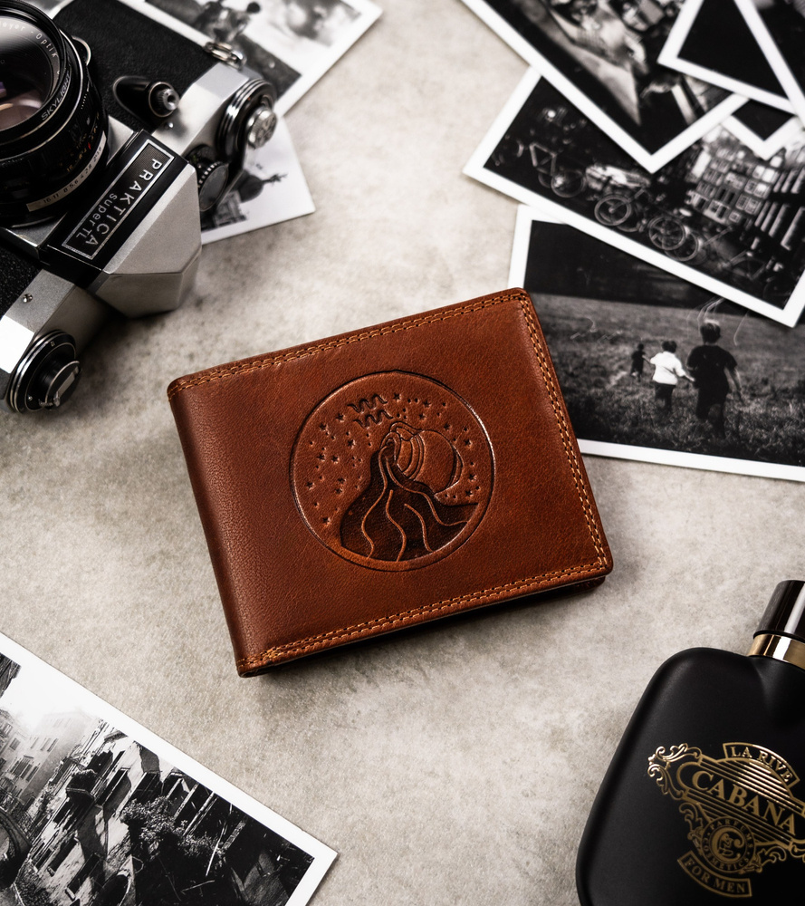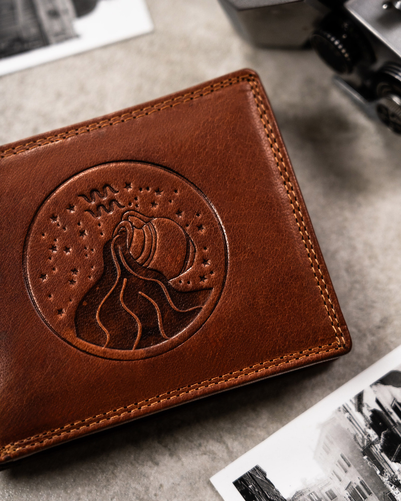 Portfel odszyty z trwałej skóry naturalnej o klasycznej stylistyce. Model w orientacji poziomej bez zapięcia zewnętrznego. Jako symbol Twojej osobowości na froncie portfela został wytłoczony Twój znak zodiaku, co sprawia, że nabiera on uroku i oryginalności.
