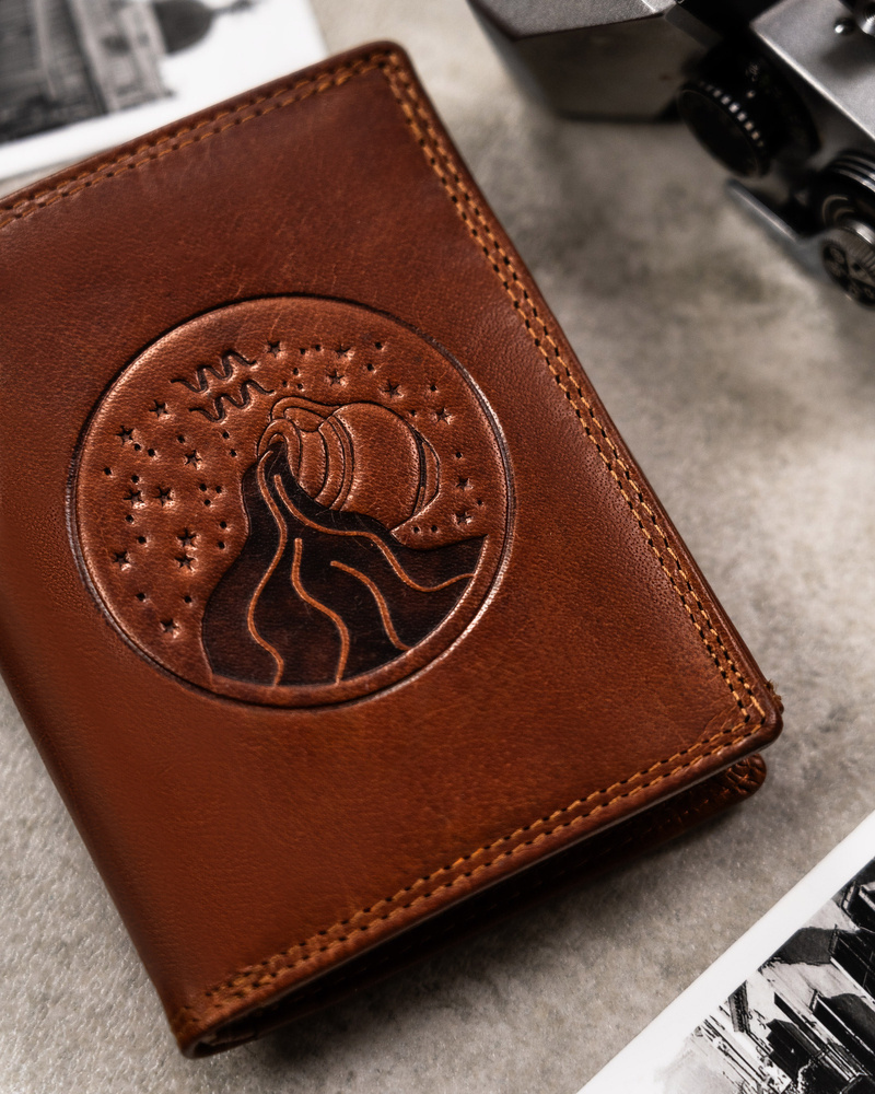 Portfel odszyty z trwałej skóry naturalnej o klasycznej stylistyce. Model w orientacji pionowej bez zapięcia zewnętrznego. Jako symbol Twojej osobowości na froncie portfela został wytłoczony Twój znak zodiaku.