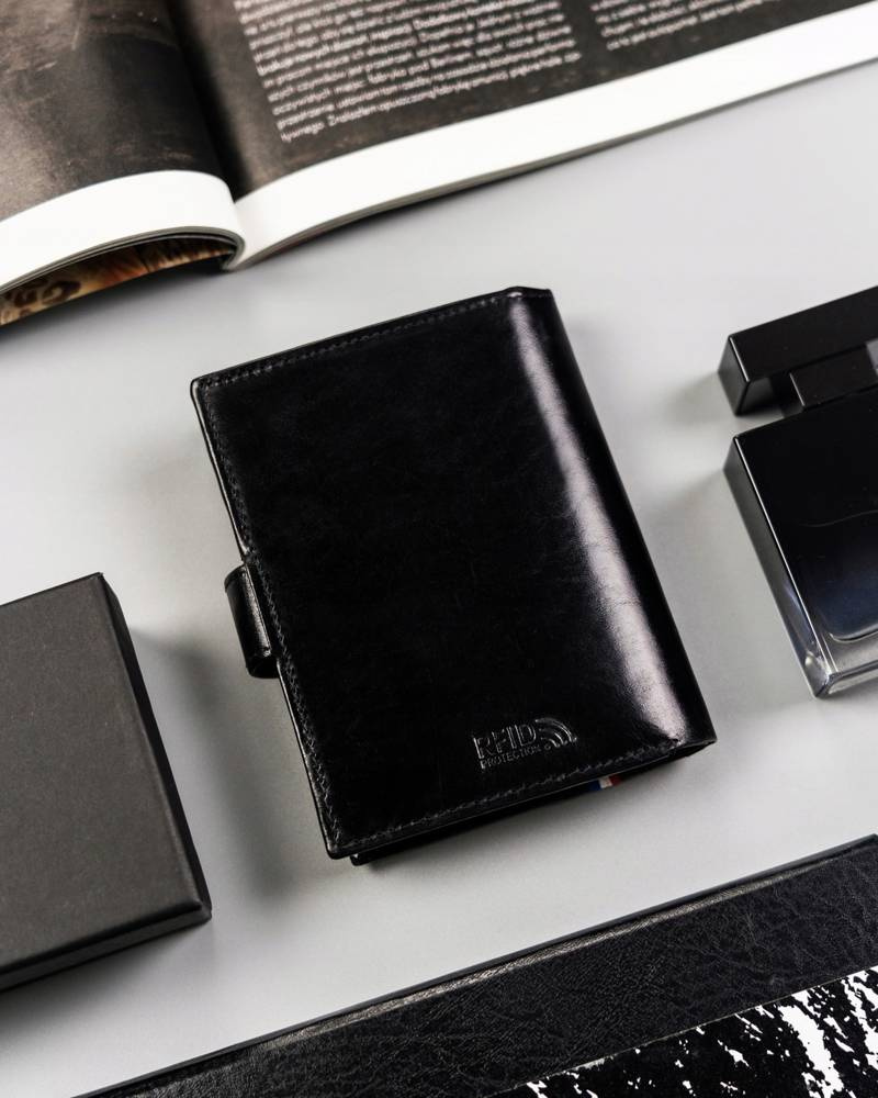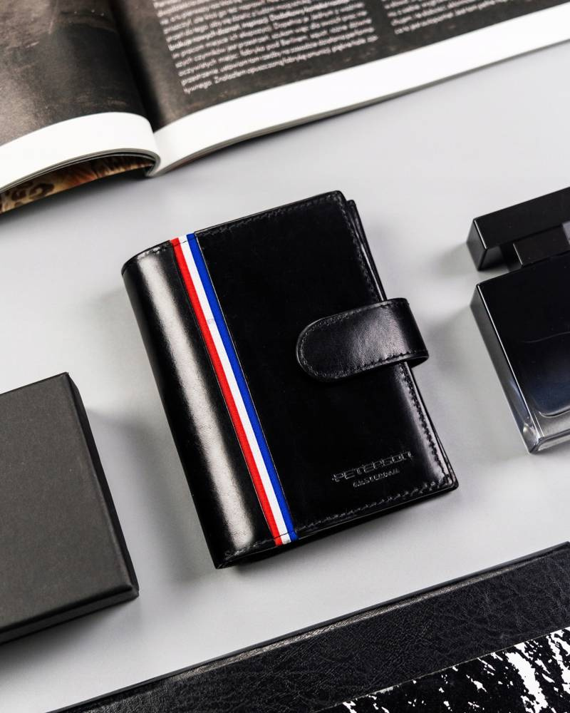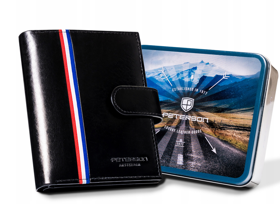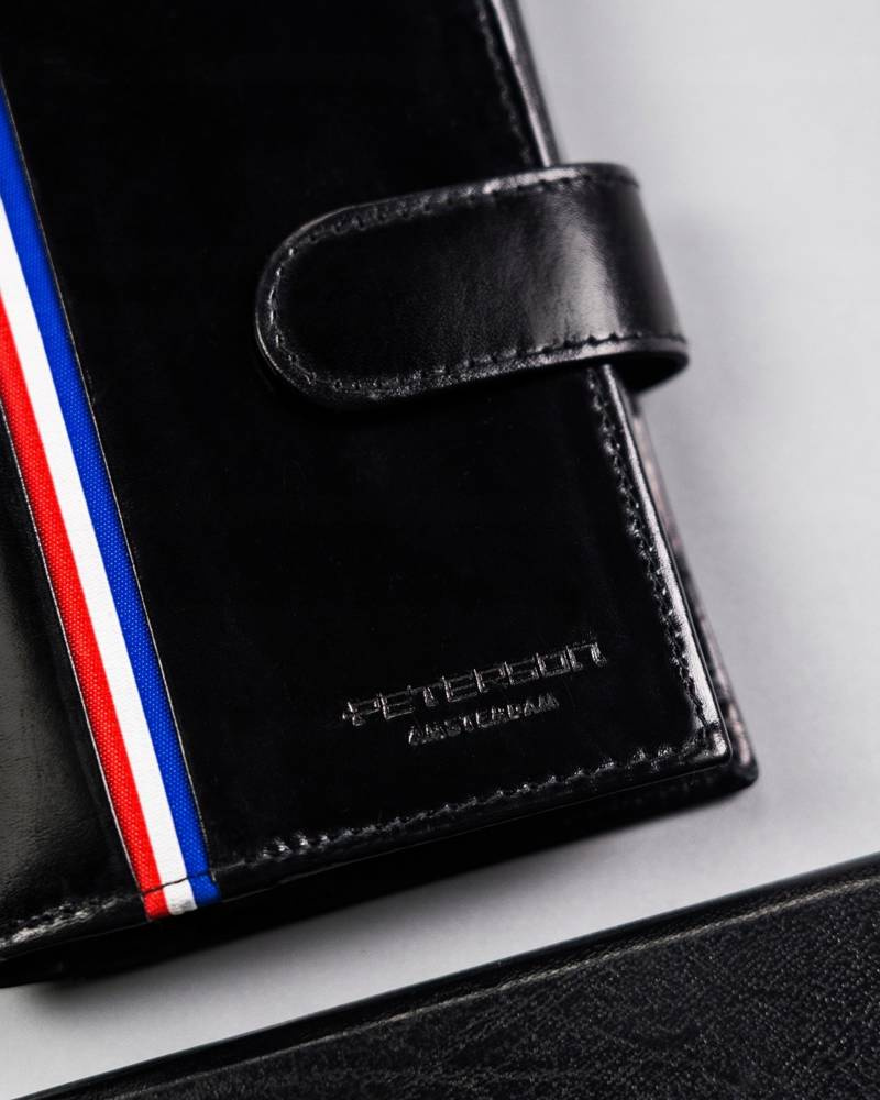 - Modny design | Odszyty bardzo trwale z doskonałej jakości gładkiej skóry naturalnej w czarnym kolorze, dodatkowo na froncie portfela wyszyto trójkolorowy paseczek;