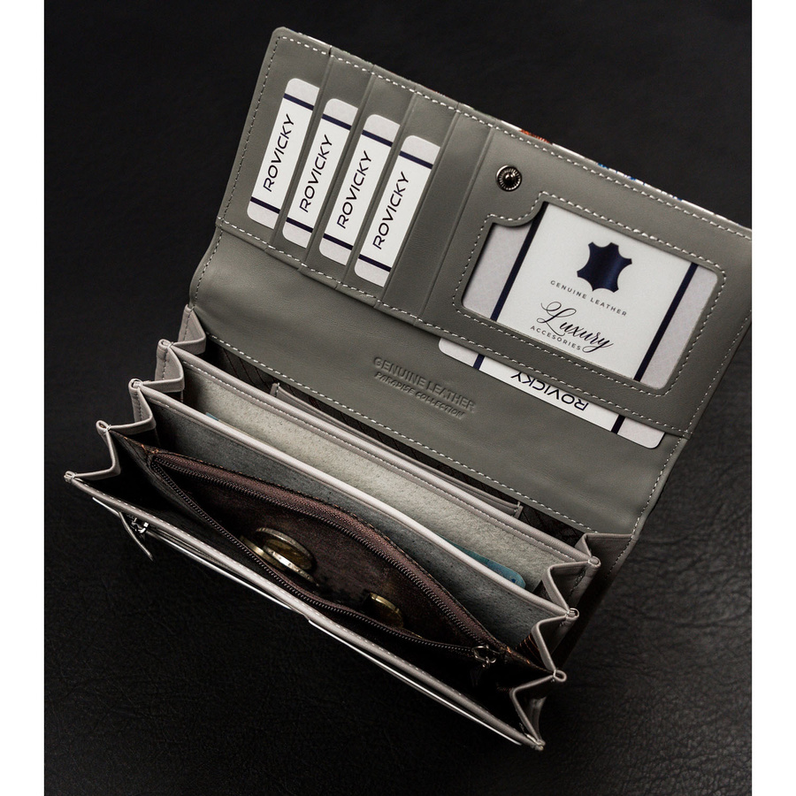 Ten model przypomina świetnie zorganizowane biurko, ponieważ kryje w sobie mnóstwo kieszonek i przegródek. Już nigdy nie zabraknie Ci miejsca do schowania kart lojalnościowych, dokumentów czy zdjęć rodziny.
