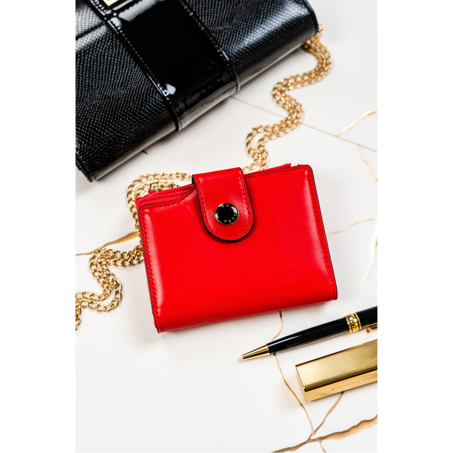 Pojemny, dwukomorowy portfel damski z zapięciem na zatrzask i suwak. Pierwsza jego część wyposażona jest w szereg praktycznych przegródek do przechowywania kart i dokumentów.