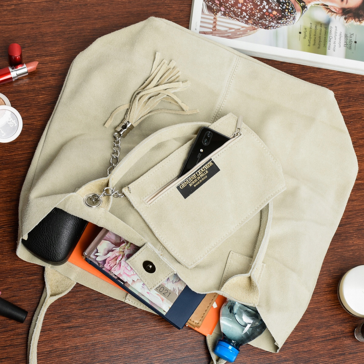 - Torebkę wyprodukowano we Włoszech z wysokiej jakości zamszowej skóry naturalnej