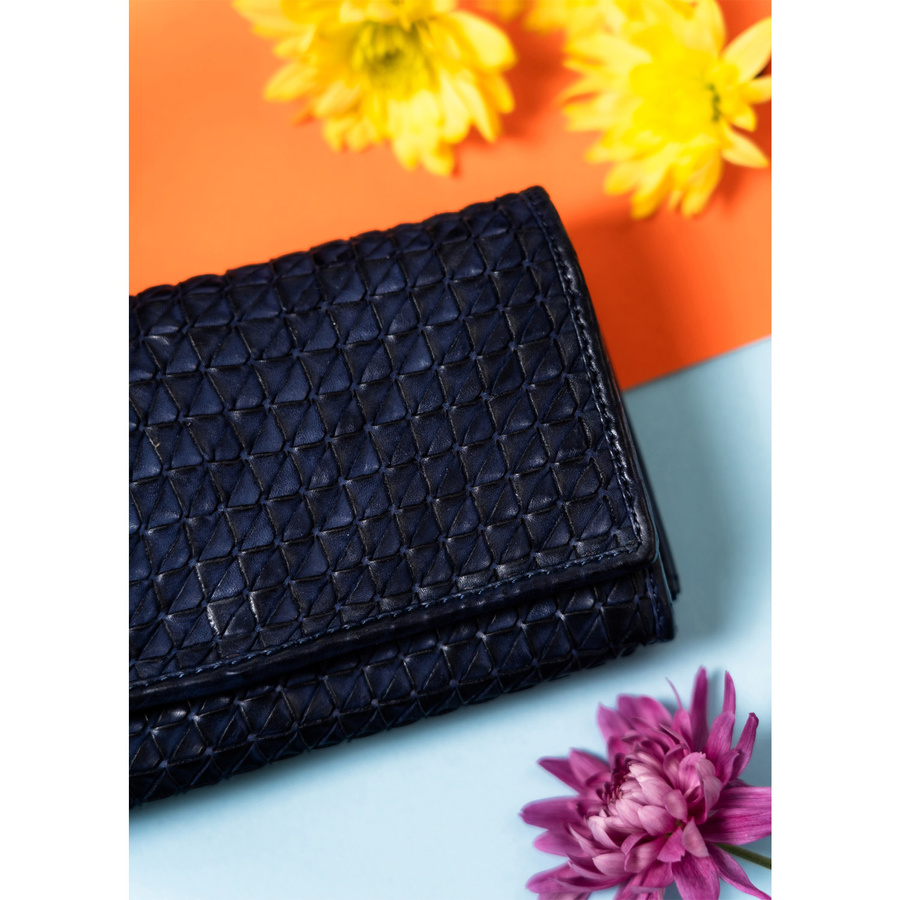 - Jego unikalny charakter podkreślają precyzyjnie przeplecione paski ze skóry na powierzchni, tworzące efekt trójwymiarowej tekstury w geometryczny wzór. Wypukłe kształty dodają elegancji i wyróżniają produkt na tle innych akcesoriów.