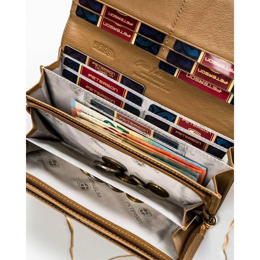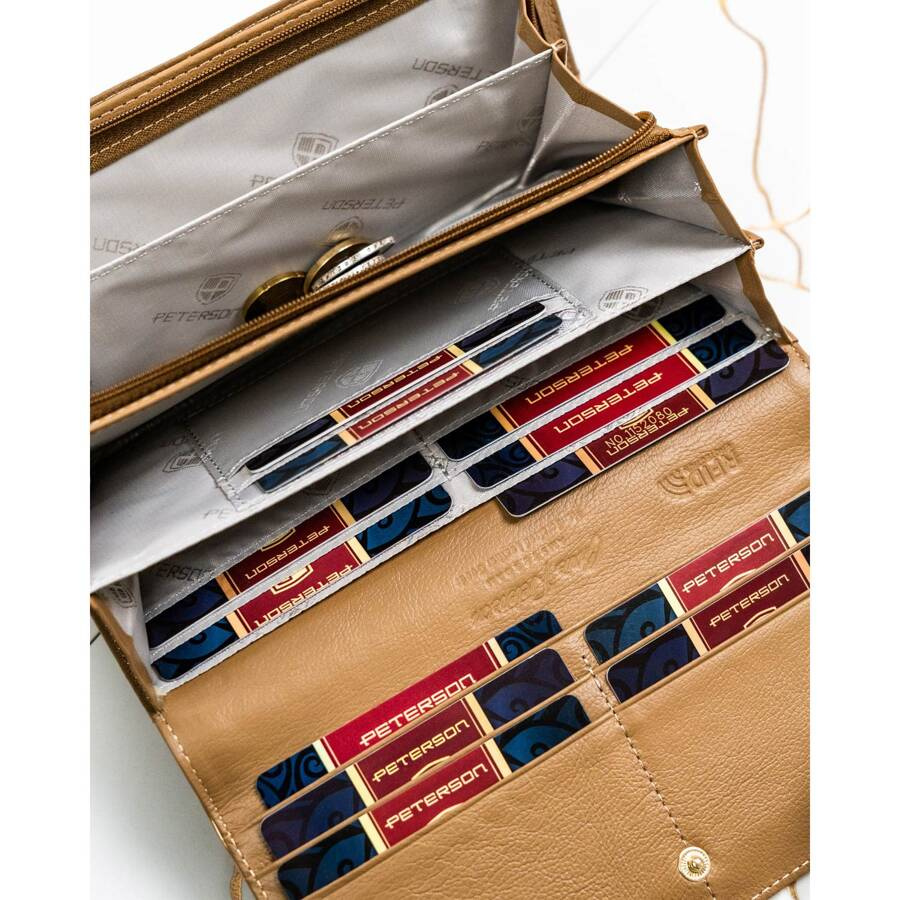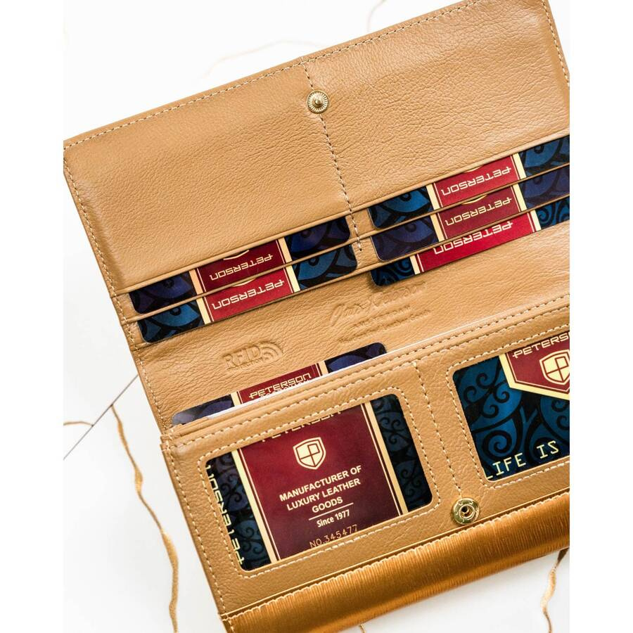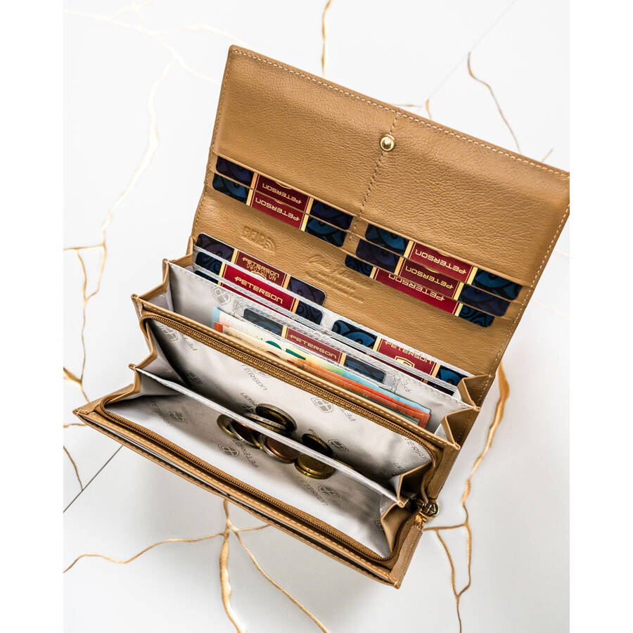 - Lakierowana skóra naturalna dodaje całości wyrafinowanego blasku, który pięknie komponuje się ze złotymi akcentami. Delikatne logo Peterson® w złotej barwie, umieszczone na przodzie, dyskretnie podkreśla luksusowy charakter portfela.