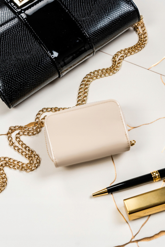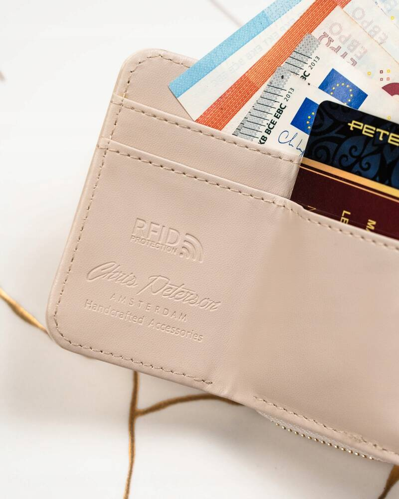 - 1 podwójnej kieszeni zamykanej na zamek błyskawiczny. Kieszeń ta jest oddzielną sekcją portfela.