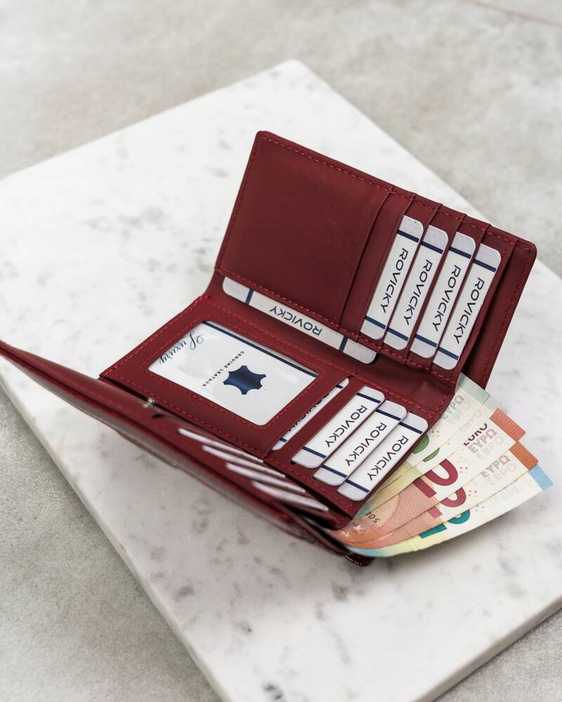 - banknoty znajdą swoje miejsce w otwartej przegródce wyszytej po całej szerokości portfela.