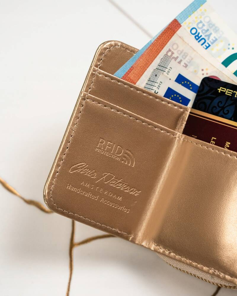 - 1 podwójnej kieszeni zamykanej na zamek błyskawiczny. Kieszeń ta jest oddzielną sekcją portfela.