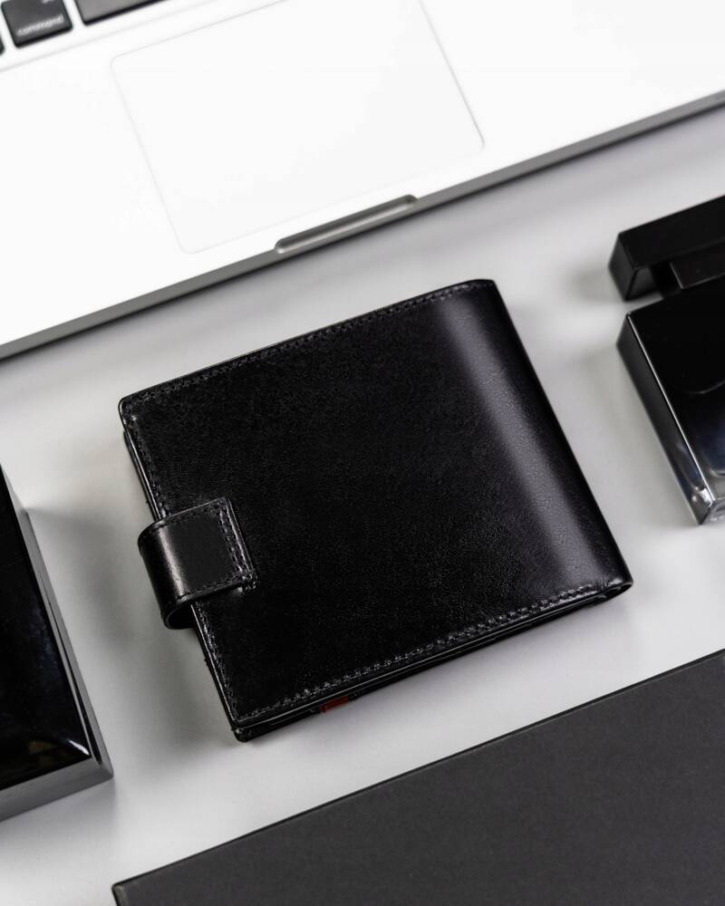 - Klasyczny fason i nowoczesne rozwiązania | Portfel w czarnym kolorze z czerwonym akcentem na froncie;