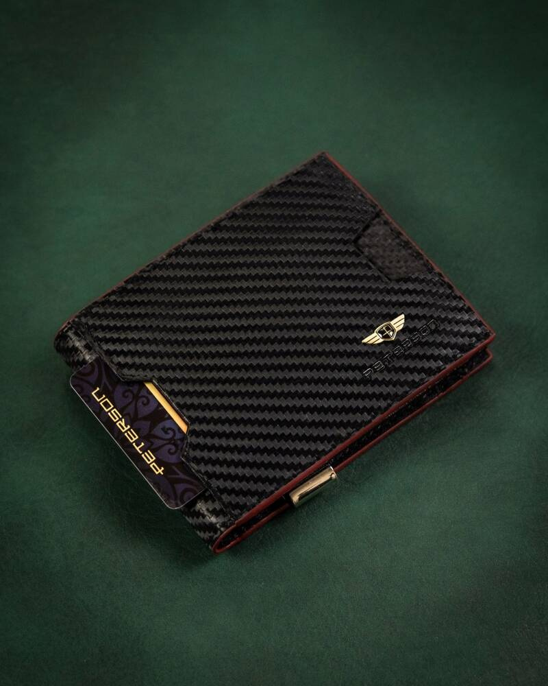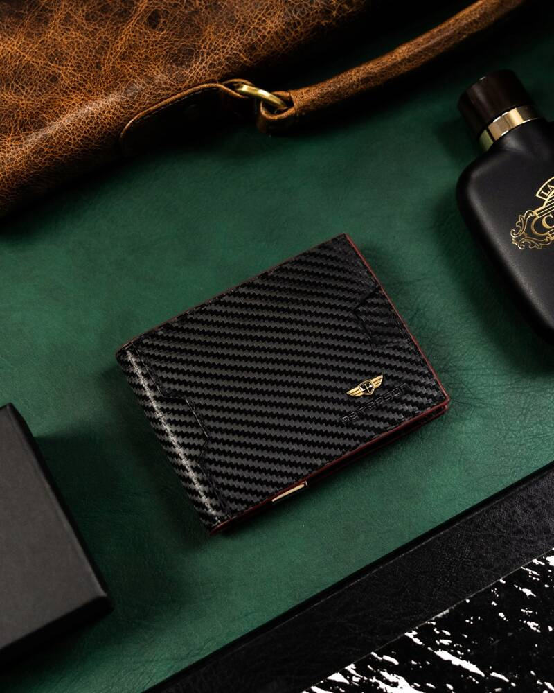 - Najwyższa jakość wykonania – portfel wykonany został z wysokiej jakości skóry naturalnej powleczonej z zewnątrz warstwą do złudzenia przypominającą włókno węglowe (carbon);