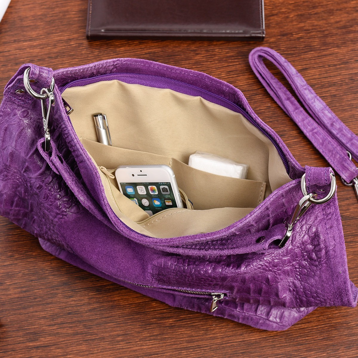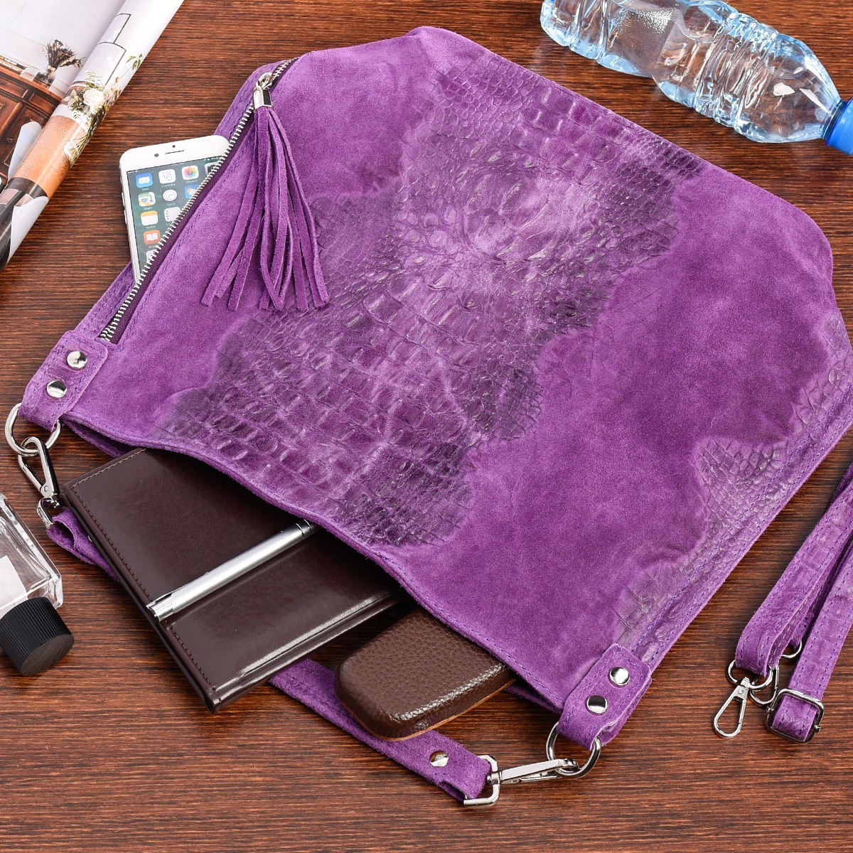 - Modną ozdobę stanowi również długi, zamszowy frędzel, będący brelokiem bocznej kieszonki torby