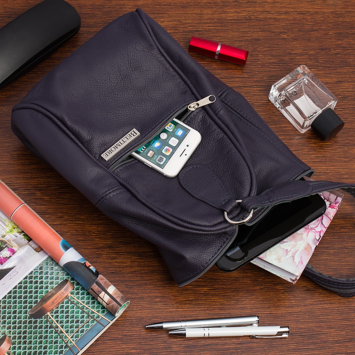 Główna komora zasuwana jest na suwak. W środku pomieszczą się dokumenty formatu A5 i inne, przydatne przedmioty