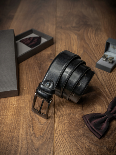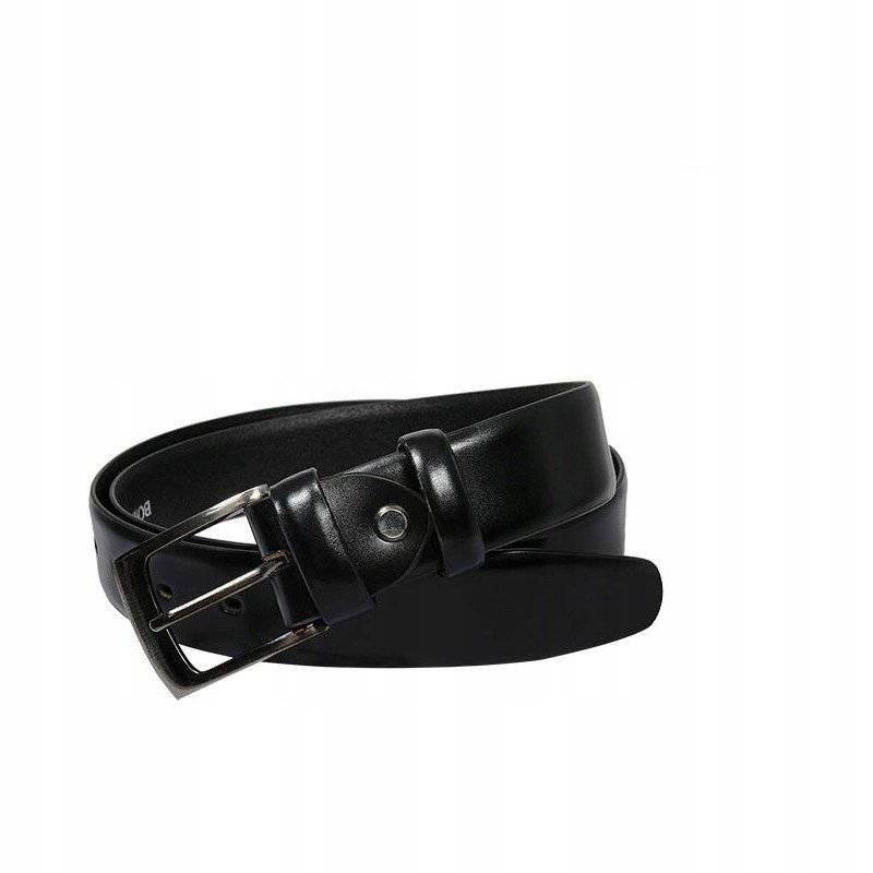 Pasek wykonany z wysokiej jakości skóry naturalnej w kolorze czarnym, z klasyczną prostą metalową klamrą.