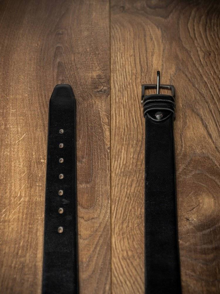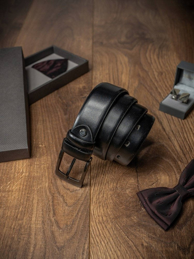 Pasek wykonany z wysokiej jakości skóry naturalnej w kolorze czarnym, z klasyczną prostą metalową klamrą.