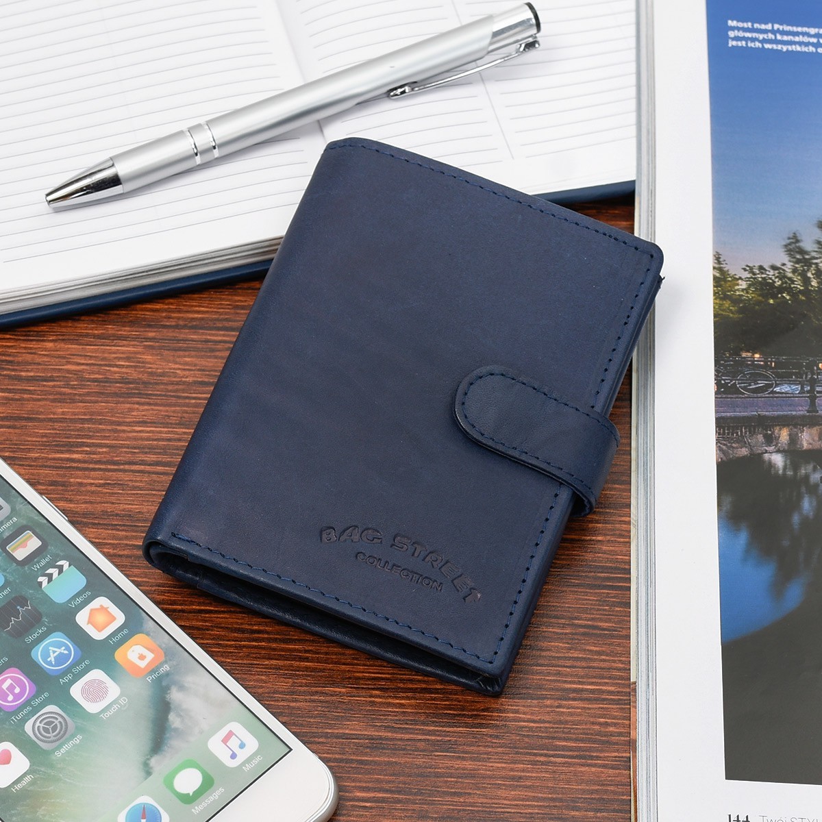 Granatowy klasyczny portfel pionowy Bag Street skórzany pojemny 882