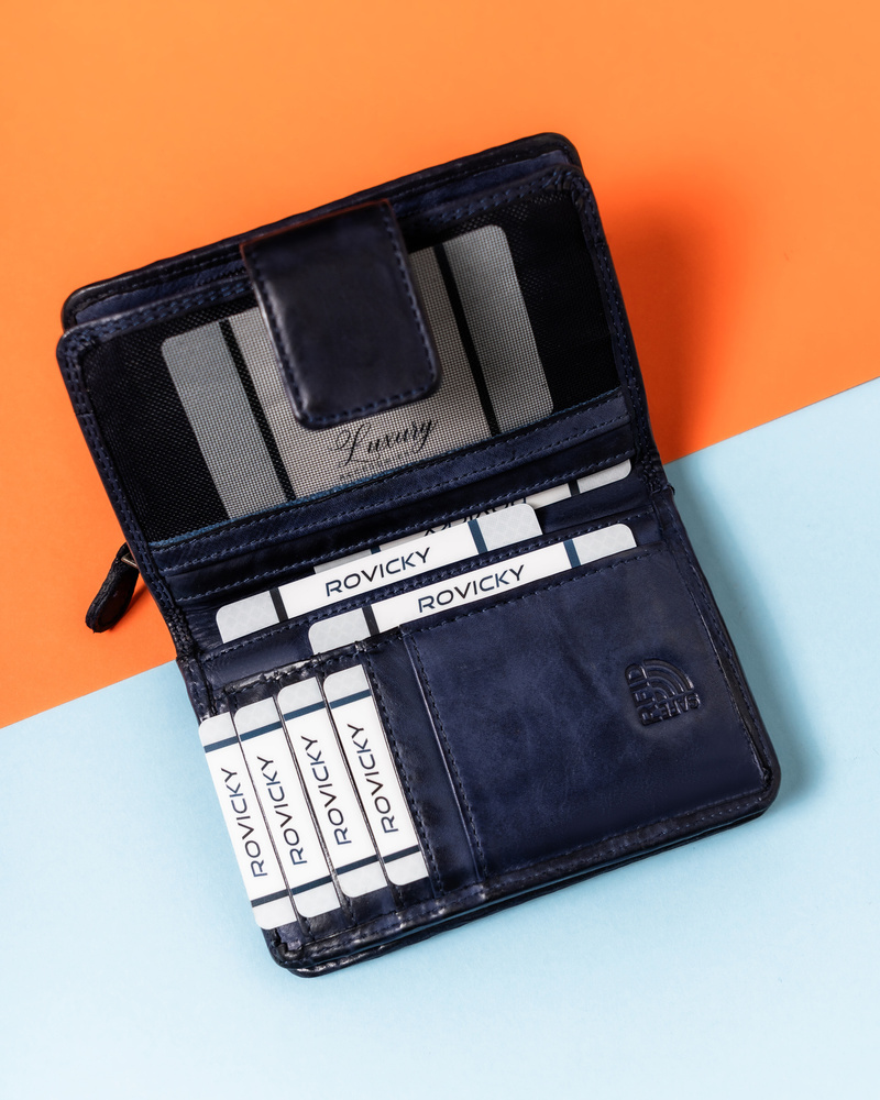Granatowy portfel damski na dokumenty i karty z RFID – Rovicky